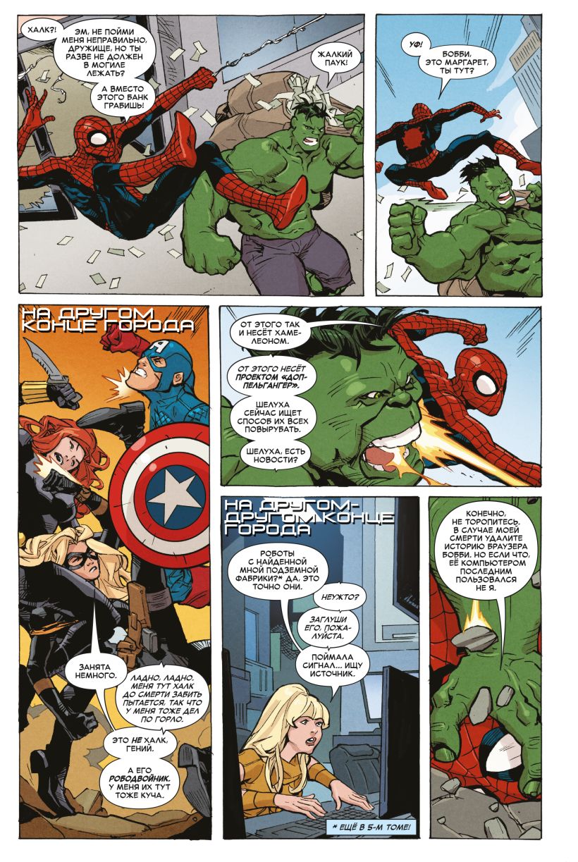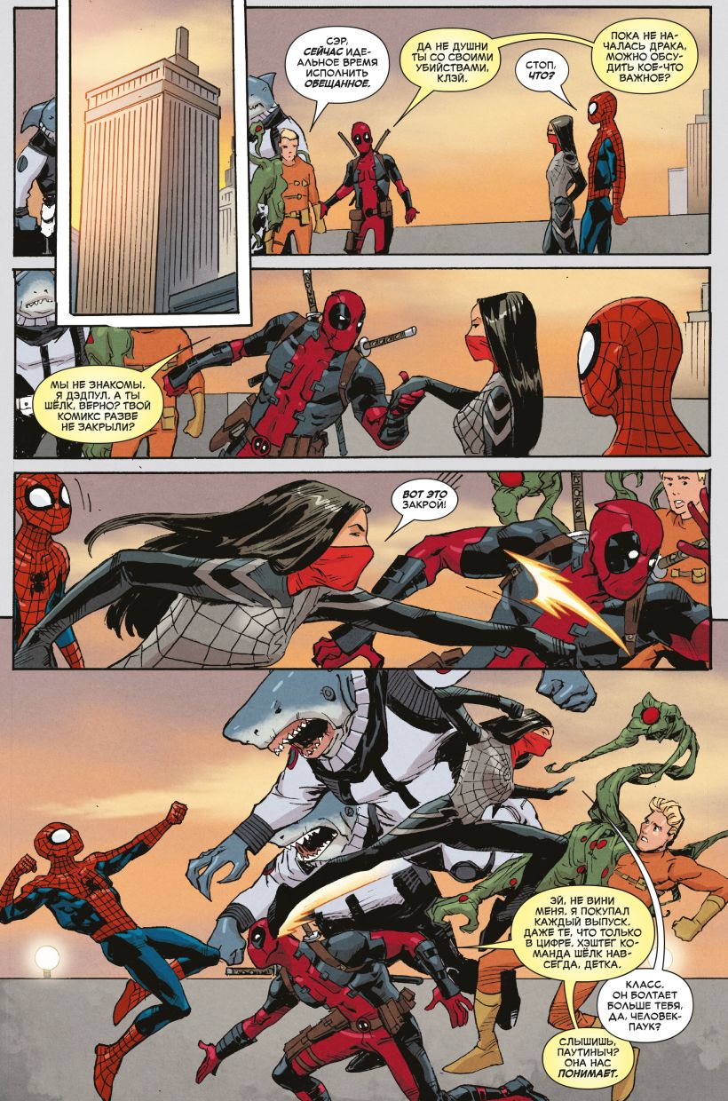 ДВЕ ВРЕМЕННЫЕ ЛИНИИ, четыре героя и множество проблем! В настоящем Паук и Дэдпул бьются с толпой робо-Пулов, в будущем пытаются разобраться с проблемами прошлого. Которое настоящее. Тем не менее эти линии пересекутся, поэтому неважно, что есть что — и всё из-за Клонпула! Кто он, что он и откуда вообще взялся? В итоге дело примет нешуточный оборот — грядёт война со всеми супергероями Marvel! Встречайте новый том приключений вашего любимого дуэта в компании старых и новых знакомых. Да, ещё здесь есть Фантастическая Четвёрка Будущего! Кем бы они ни были.