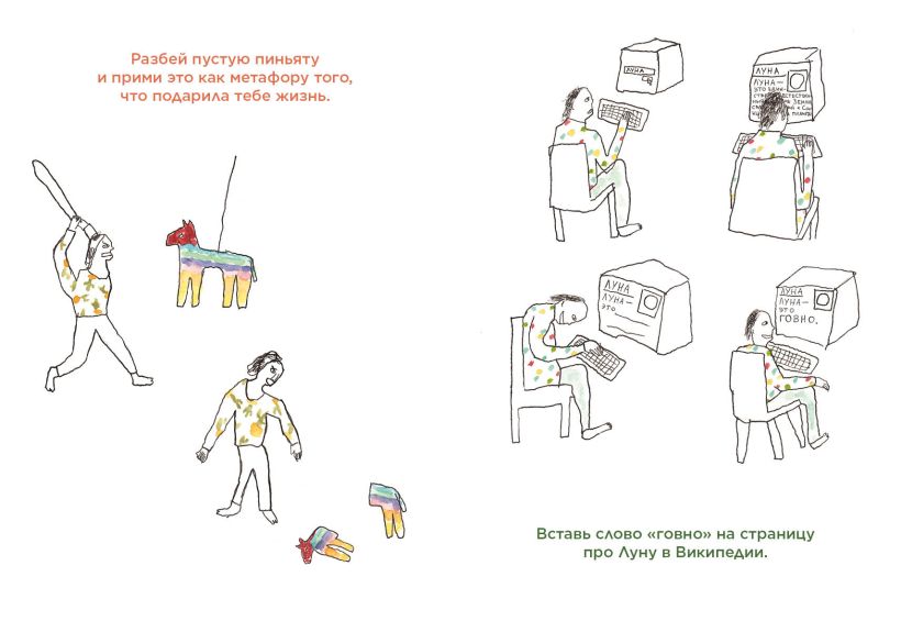 Не так часто в развлекательной литературе затрагивают настолько серьёзные тему, как и в рассмотрении проблемы суицида далеко не часто прибегают к ироничному подходу. Но ведь действительно: вместо того, чтобы закончить всё прямо сейчас, почему бы вам не разбить яйцо с нарисованной на нём рожицей? Или поискать что-нибудь с металлоискателем, зная, что всё равно ничего не найдёте? Или отредактировать страницу Луны на Википедии? Эта книга — сто кадров, помогающих выжить; личная история авторов; чёрный юмор и абсурдные сюжеты, которые отлично справляются с поставленной в заголовок задачей. Эдакие "Вредные советы" современности. Здесь вы найдёте лучшие альтернативы страданиям от психических проблем! И не забудьте придумать свой список после прочтения!