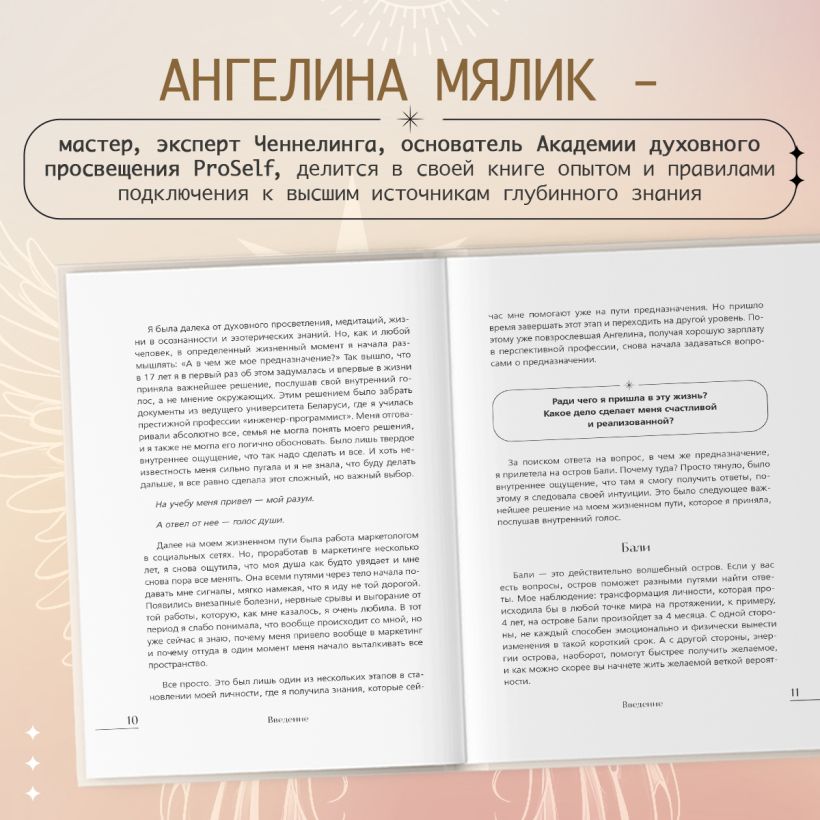 Искусство ченнелинга доступно каждому из вас, если следовать определенным практикам, а главное, развивать и слушать свою интуицию. Как услышать свое истинное я и выйти на новый уровень жизни? Мастер ченнелинга и основательница Академии духовного просвещения ProSelf, известный блогер Ангелина Мялик делится в своей книге опытом подключения к Хроникам Акаши, общения с ангелами и считывания информации из безграничного поля Вселенной. Каждый, кто будет следовать наставлениям автора, откроет глубину своей интуиции, научится получать ответы на все свои вопросы от ангелов. 50% информации в книге получены с помощью ченнелинга от высших созданий, которые поделились сакральными знаниями, чтобы изменить вашу жизнь к лучшему и наполнить ее светом!