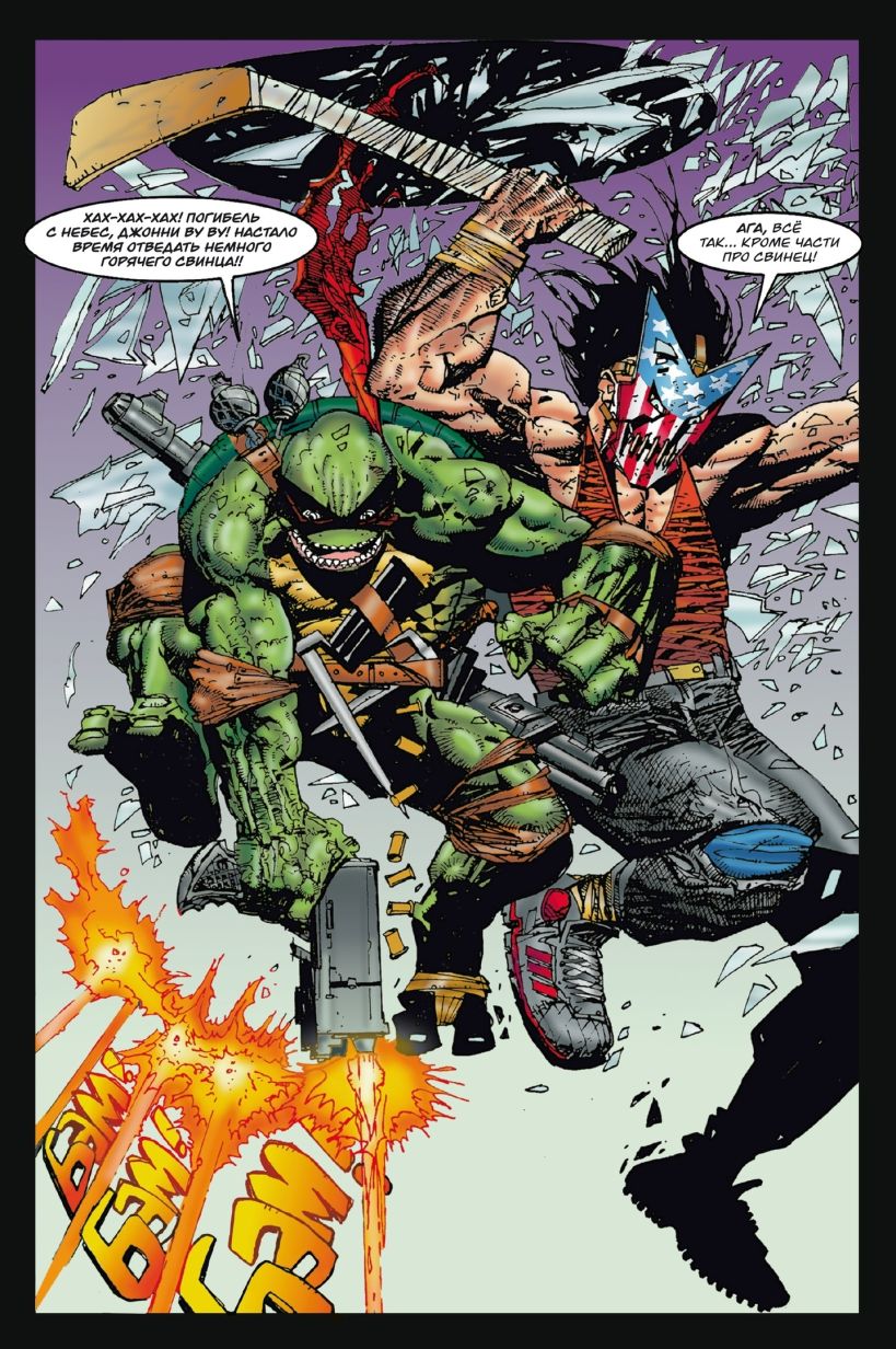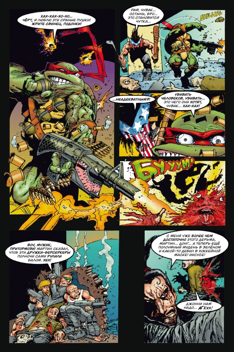 Самый жёсткий и крутой комикс про Черепашек-ниндзя, вдохновлённый подпольными журналами Heavy Metal и боевиками Джона Ву! Брутальная парочка Рафаэль и Кейси Джонс попадают на грязные улицы Нью-Йорка 80-х, и теперь им предстоит столкнуться с убийцами, роботами, ниндзя, бандитами... Но на этот раз они не стесняются применять своё оружие по полной, не гнушаясь даже пушками и бомбами! Столько крови, взрывов и перестрелок в комиксах про Черепашек-ниндзя вы ещё не видели!