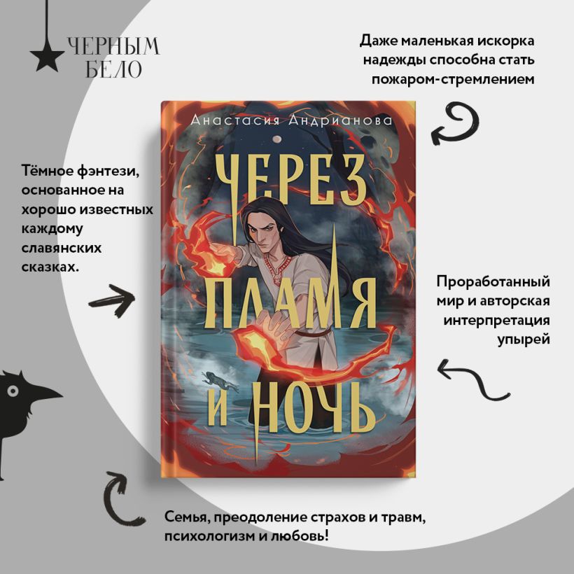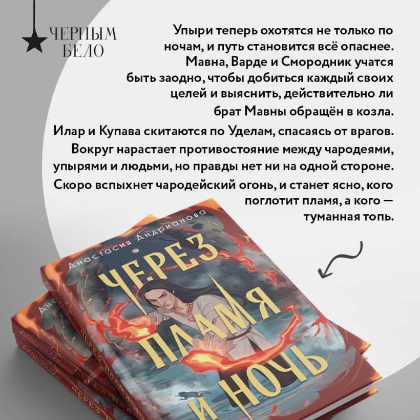 "Через пламя и ночь" совсем другая. Она эмоциональная, насыщенная на события. Обложка тоже это отражает, полыхает огнём. Герои делают мыслимое и немыслимое, творят глупости, постепенно становятся серьёзнее и мудрее, совершают поступки, а потом обретают то, что им положено.