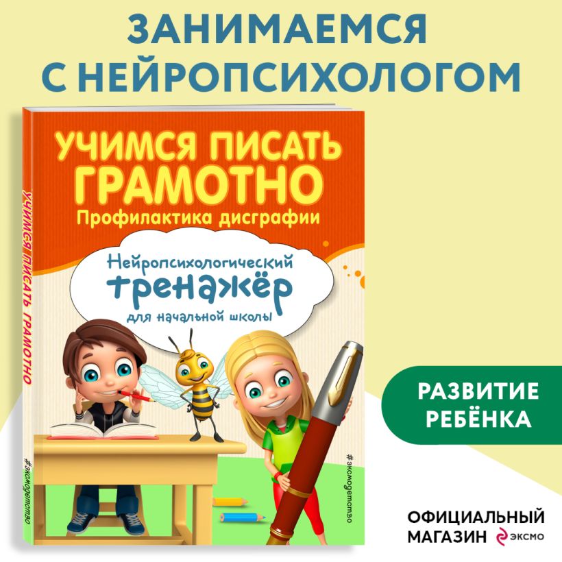 Пособие по развитию навыка грамотного письма от издательства «Эксмо» подготовлено практикующим нейропсихологом, который каждый день помогает учащимся начальной школы справиться с проблемами, возникающими в обучении. Цель книги — повысить общую грамотность учеников 3—4 классов. Нейротренажер разделен на главы по отдельным правилам. Сами правила русской орфографии сформулированы в стиле рэп. Их можно не только читать, но и пропеть и протанцевать — так будет легче их понять и запомнить. Во главу угла поставлен метод обведения букв по контуру, который дает очень высокий результат, одновременно корректируя почерк, формируя образ слова и активизируя моторную память. Вопросы и задания каждой темы выстроены в определенном порядке, что способствует активизации механизмов соответствующих отделов мозга и обосновано нейропсихологически. Внутри глав имеются забавные стихотворные тексты, к каждому из которых дается несколько несложных заданий. Ко всем упражнениям, кроме творческих, имеются ответы, позволяющие учащимся проверить уровень своих знаний. Использование тренажера в качестве дополнительного материала поможет ребенку своевременно устранить всевозможные сложности в усвоении школьного материала и формировании необходимых навыков. Кроме того, в серию «Уроки нейропсихолога в начальной школе» входят книги: «Развитие разных видов памяти и внимания: для детей 8—10 лет», «Исправление почерка и профилактика дисграфии: для детей 8—10 лет», «Пишу без ошибок. Развитие орфографической зоркости: для детей 9—10 лет», «Решаю быстро и правильно. Сложение и вычитание: для детей 7—8 лет», «Развитие математических способностей и навыков: для детей 9—10 лет», «Говорю грамотно. Развитие речевого потенциала: для детей 8—10 лет».