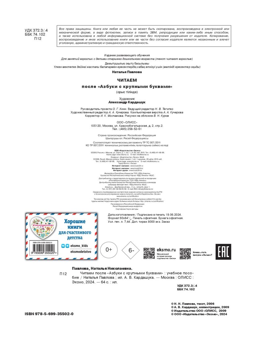 Чтение — основной навык, от которого зависит не только успех ребенка в школе, но и его будущее. Наиболее эффективный метод обучения чтению — слоговой. Сочетание этого метода с письмом и постепенным усложнением — от букв к слогам, словам, потом к простым предложениям и текстам — гарантирует устойчивый успех и прогресс, который будет заметен ребенку и станет мотивировать его к обучению. Развивающее пособие поможет ребенку легко и с удовольствием освоить базовые навыки: быстро запомнить буквы и их написание; научиться читать слоги, слова, предложения и тексты, увеличить словарный запас, развить речевые навыки. Вместе с этим пособием чтение превратится в интересное приключение, и ребенок не заметит, как пролетит время. Книга-развивашка, предназначенная для совместных занятий мамы и ребенка, станет надежным помощником в процессе подготовки к школе. Простые задания легко выполнять дома, на прогулке или в дороге. Обучение, проходящее в виде веселой увлекательной игры, поможет ребенку почувствовать уверенность в своих силах. Простые задания, представленные в тренажере, легко выполнять дома, на прогулке или в дороге. Книга идеально подойдет для занятий с детьми 4, 5, 6 лет, так как учитывает их особенности восприятия и интересы.