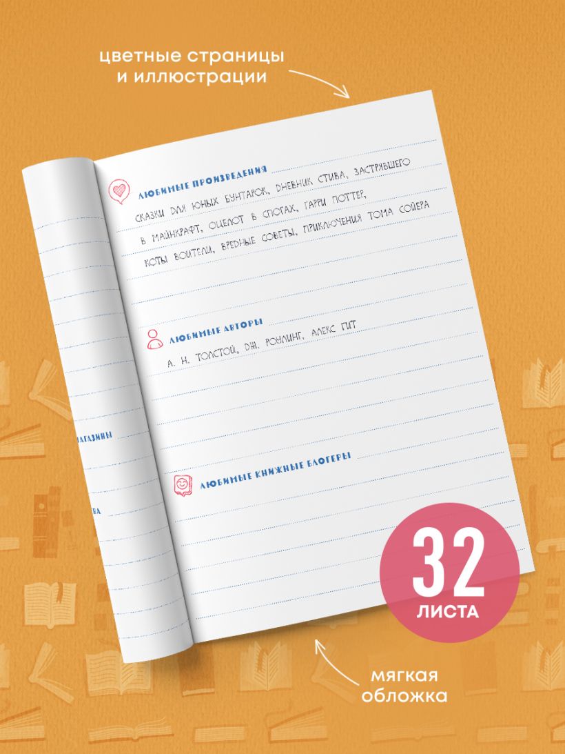 Для кого: - для тех, кто очень любит книги; - для тех, кто много читает; - для тех, кто хочет навсегда сохранить впечатления от каждой книги; - для тех, кто любит придумывать собственные интересные и захватывающие истории. В дневнике вас ждут: - пустые строки, где вы сможете составить список книг, которые планируете прочитать; - страницы, разделенные на колонки, куда вы сможете внести свои пункты для заполнения; - яркие иллюстрации, которые дополняют страницы. Еще вас ждет отличный бонус в виде набора ярких стикеров. Технические параметры: - удобный формат А5 (162×210 мм); - 64 страницы на офсетной бумаге; - стильная обложка из переплетного картона; - расчерченный блок для тех, кто хочет выразить свою индивидуальность. Читательский дневник станет отличным подарком для каждого любителя книг. Также вас порадует качество материалов, из которых выполнен дневник. Плотная обложка и страницы помогут сохранить записанное в него на долгие годы.