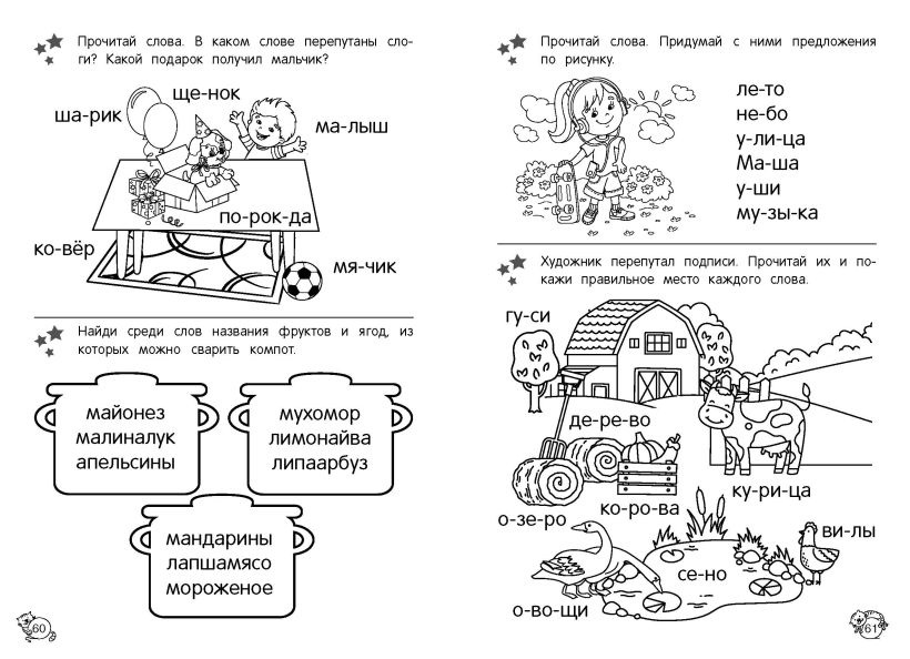 Эта книга для тех детей, которые уже научились читать, но пока делают это не очень хорошо. В ней есть небольшие по объему тексты, предложения и слова — простые по структуре, сюжет увлекательный, шрифт — крупный, как в «Азбуке». Это не простой сборник заданий, а книга-игра.