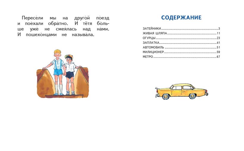 В книгу вошло семь забавных и добрых рассказов: «Затейники», «Живая шляпа», «Огурцы», «Заплатка», «Автомобиль», «Милиционер», «Метро».
