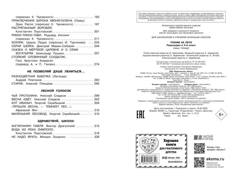 Вот и закончился второй учебный год. Ваш ребенок переведен в 3-й класс. Впереди — летние каникулы! Но у вас в руках список литературы на лето. Как успеть найти и прочесть все необходимое? Очень просто! Вы держите в руках уникальное издание, составленное специально для будущих третьеклассников. Хрестоматия содержит произведения, которые задают для прочтения на каникулах в большинстве школ, и может быть использована со всеми рекомендованными учебниками. В состав хрестоматии вошли русские народные сказки, произведения отечественных и зарубежных классиков ХIX—XX веков.