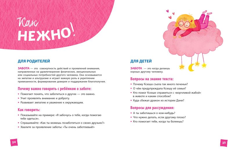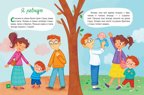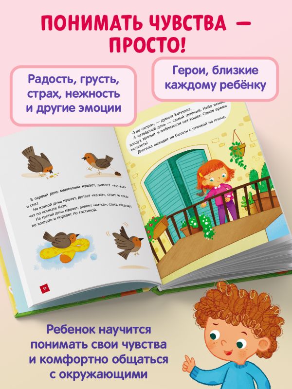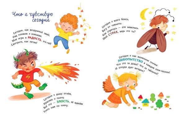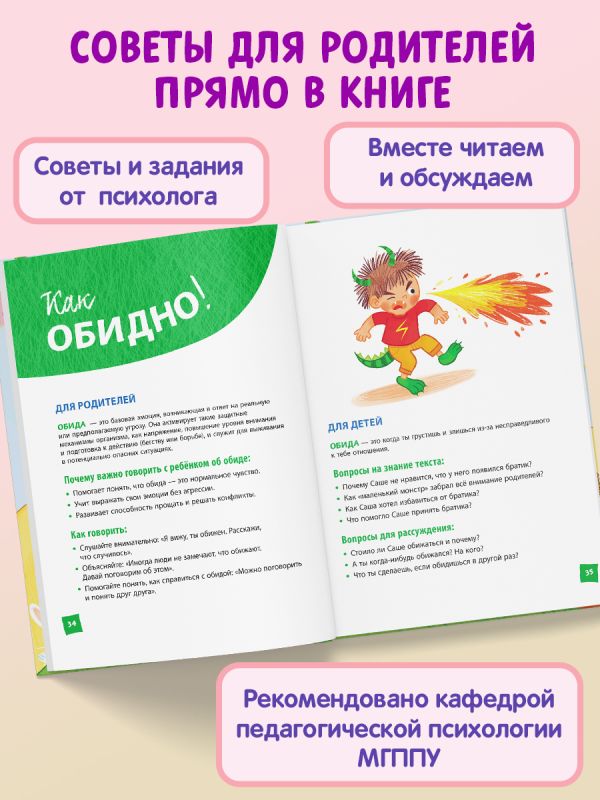Вместе анализируя поведение и поступки героев, ребёнок и его родители изучат такие эмоции, как грусть, радость, страх, вдохновение, злость, нежность, обида, любопытство. Дополнительно понять материал и закрепить знания помогают специальные странички от сертифицированного психолога с определениями и заданиями по тексту, которые расположены перед каждой историей. Это издание прекрасно подходит для формирования самых нужных навыков для дошкольника: понимать свои чувства и комфортно общаться с окружающими.