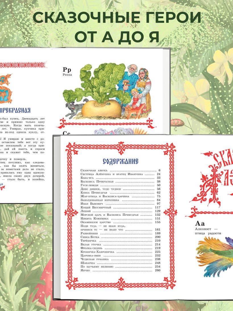 Самый удивительный сборник русских народных сказок! Особенность этой книги в том, что она выполнена в виде старославянской азбуки, где на каждую букву алфавита — своя сказка и свой сказочный герой. Василиса Прекрасная, Емеля-дурак, Царевна Несмеяна, Змей Горыныч, Кощей Бессмертный, Царевна-Змея, сестрица Аленушка — все самые любимые персонажи и их сказочные приключения собраны в книге «Чудо чудное, диво дивное».