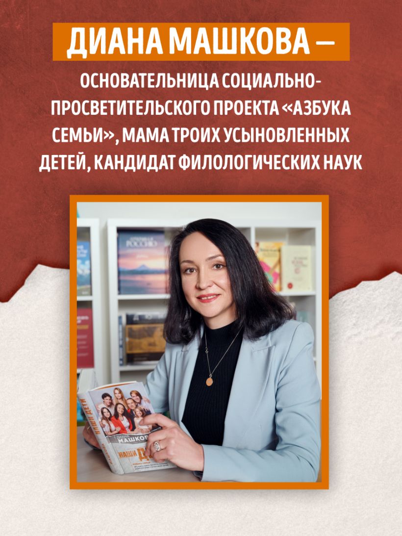 Диана Машкова — кандидат филологических наук, в далеком прошлом — преподаватель университета, в недавнем — главный редактор солидного журнала. В настоящее время является постоянным автором издательства «Эксмо» и основателем некоммерческой организации «Азбука семьи», в которой вместе с мужем Денисом Салтеевым и большой командой психологов развивает всероссийскую сеть школ родителей. Супруги в браке двадцать восемь лет, у них пятеро детей. Диана знает, что сберечь семейное счастье непросто — мамам и папам порой бывает нужна поддержка, чтобы улучшить отношения друг с другом и наладить контакт с детьми. Книги Дианы помогают справляться с трудностями и находить гармонию в семье.