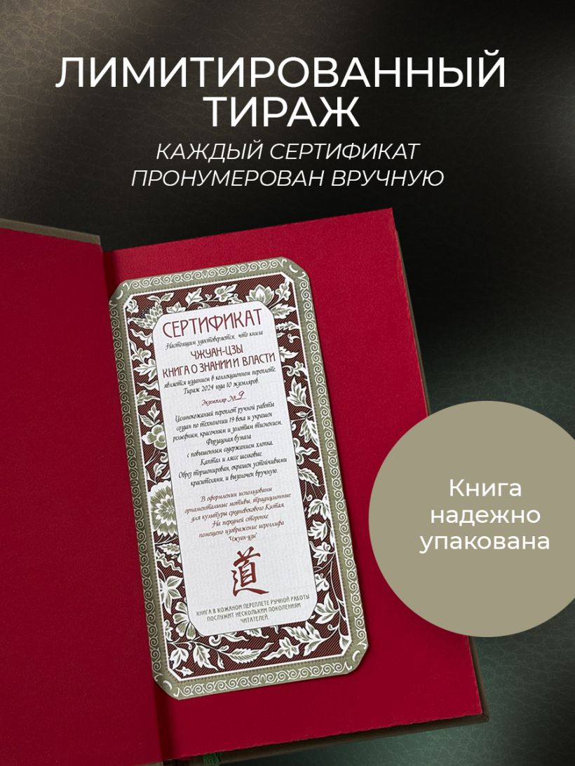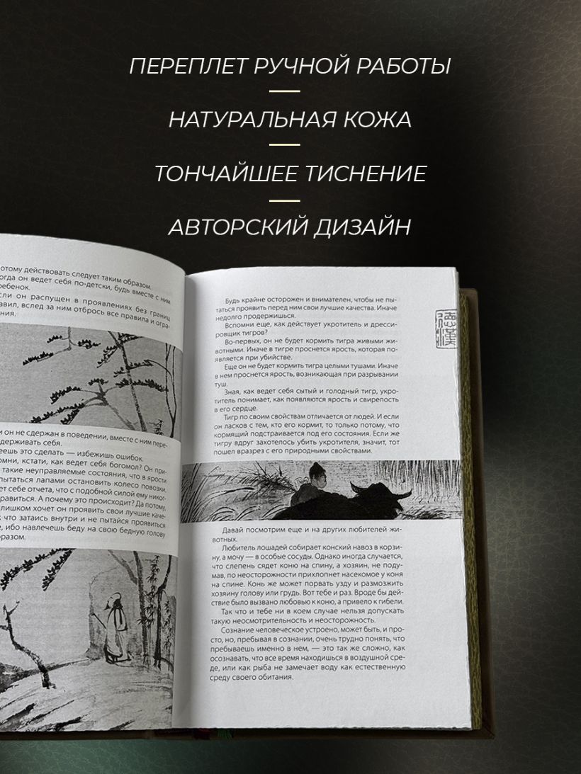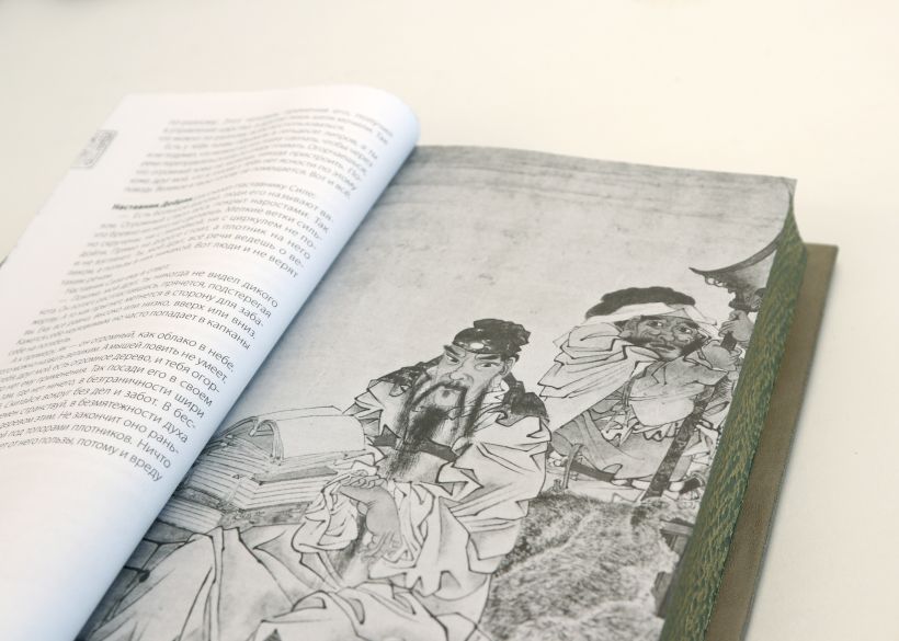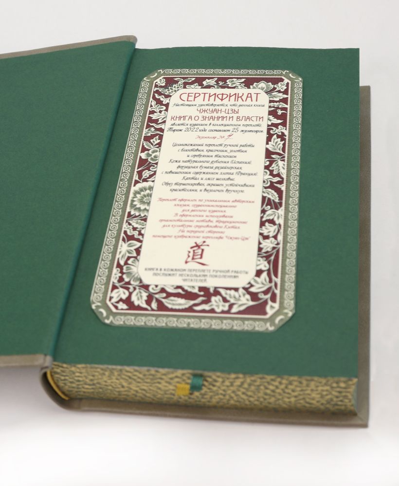 Подарочное издание в изящном коллекционном переплете ручной работы. Книга отпечатана на плотной бумаге. Переплет создан по технологии 19 века в лучших традициях книжного искусства. Кожа на переплёте цвета светлого нефрита. Тиснение рельефное, золотое и натуральным пигментом. Корешок кругленый. Обрез торшонирован, окрашен и вызолочен вручную. На передней сторонке помещено изображение иероглифа с именем Чжуан-Цзы. Переплет оформлен по авторским рисункам, выполненным специально для данного издания, в оформлении использованы изобразительные мотивы, традиционные для культуры Средневекового Китая. Форзацы из фактурной бумаги, каптал из шелка и ляссе двух цветов. К книге прилагается сертификат, подтверждающий лимитированный тираж переплета ручной работы. Книга в кожаном переплете ручной работы послужит нескольким поколениям читателей.