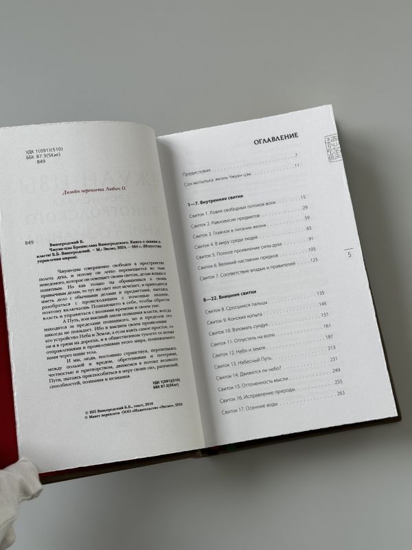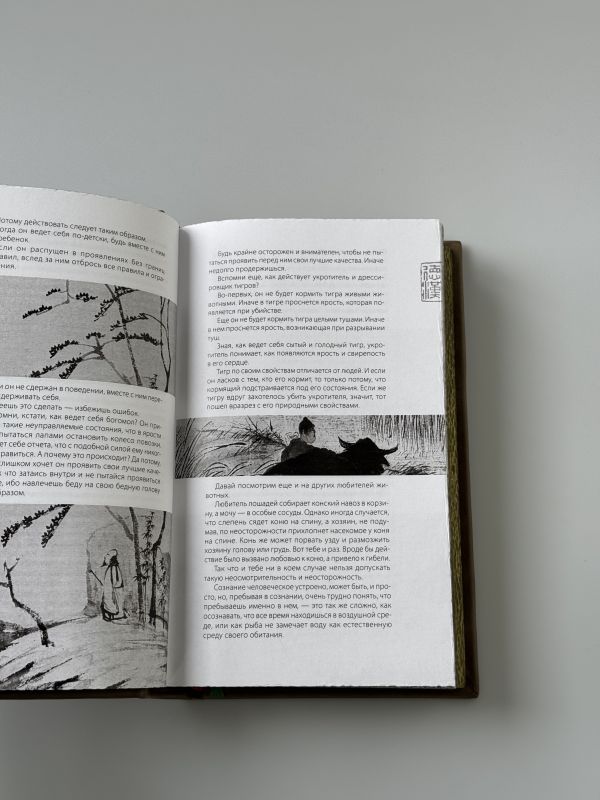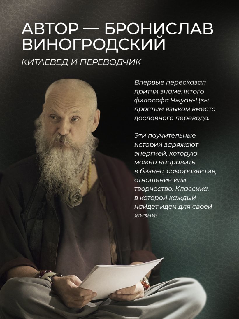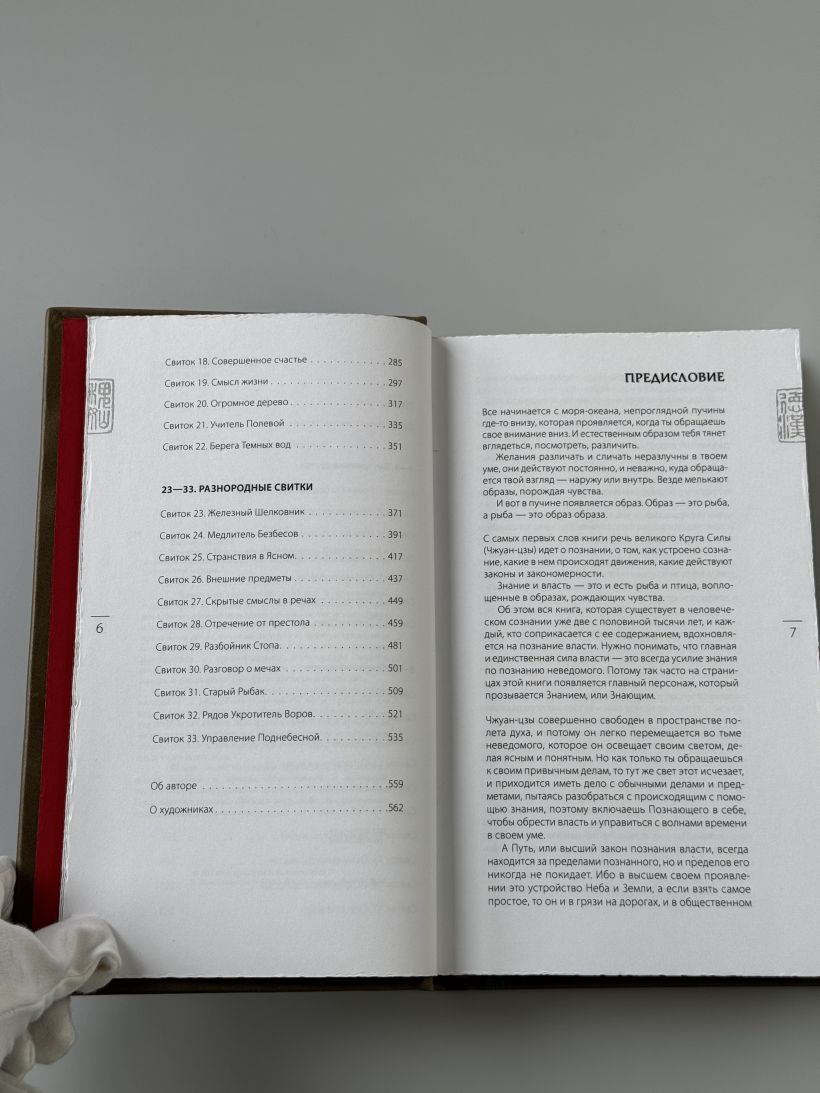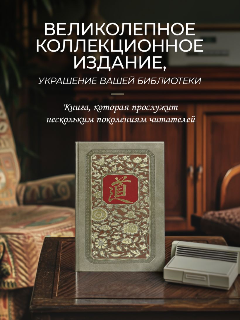 Подарочное издание в изящном коллекционном переплете ручной работы. Книга отпечатана на плотной бумаге. Переплет создан по технологии 19 века в лучших традициях книжного искусства. Кожа на переплёте цвета светлого нефрита. Тиснение рельефное, золотое и натуральным пигментом. Корешок кругленый. Обрез торшонирован, окрашен и вызолочен вручную. На передней сторонке помещено изображение иероглифа с именем Чжуан-Цзы. Переплет оформлен по авторским рисункам, выполненным специально для данного издания, в оформлении использованы изобразительные мотивы, традиционные для культуры Средневекового Китая. Форзацы из фактурной бумаги, каптал из шелка и ляссе двух цветов. К книге прилагается сертификат, подтверждающий лимитированный тираж переплета ручной работы. Книга в кожаном переплете ручной работы послужит нескольким поколениям читателей.