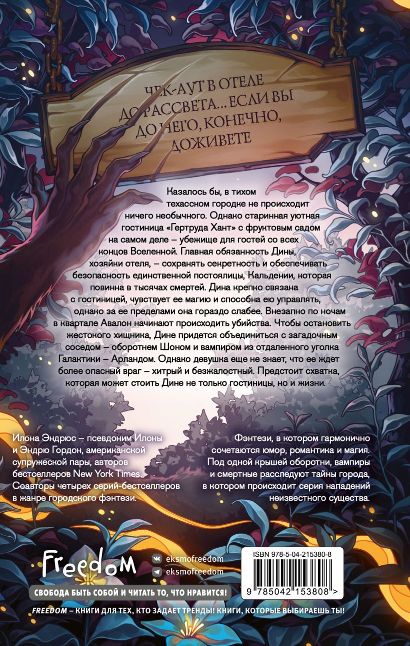 Казалось бы, в тихом техасском городке не происходит ничего необычного. Однако старинная уютная гостиница «Гертруда Хант» с фруктовым садом на самом деле – убежище для гостей со всех концов Вселенной. Главная обязанность Дины, хозяйки отеля, – сохранять секретность и обеспечивать безопасность единственной постоялицы, Кальдении, которая повинна в тысячах смертей. Дина крепко связана с гостиницей, чувствует ее магию и способна ею управлять, однако за ее пределами она гораздо слабее.
