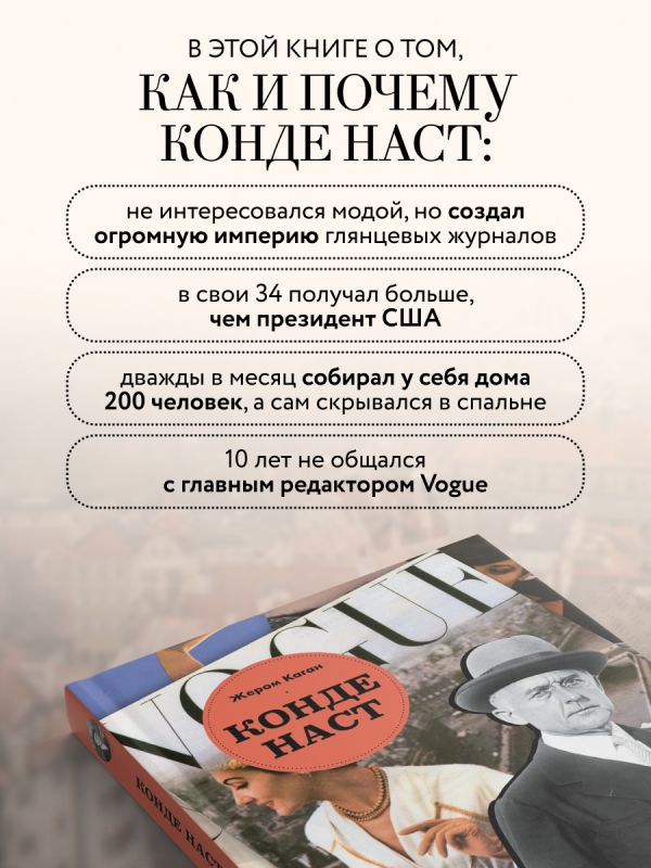 Эта книга рассказывает о жизни и невероятном успехе Конде Наста — основателя крупнейшей модной медиа-империи Condé Nast. Для одних он был бизнесменом с удивительным чутьём, для других — суровым трудоголиком. Конде всегда старался оставаться в тени, что порождало множество слухов, мифов и даже легенд. Кем же на самом деле был этот болезненно-скромный мужчина, которого считают прототипом главного героя романа «Великий Гэтсби»?