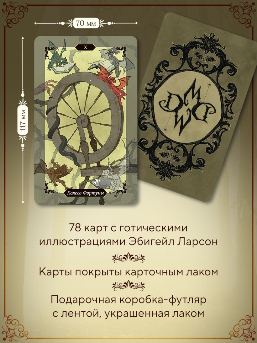 • 78 карт, завораживающие и таинственные иллюстрации для которых созданы художницей Эбигейл Ларсон.