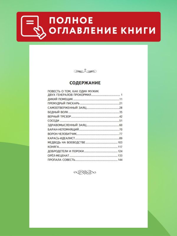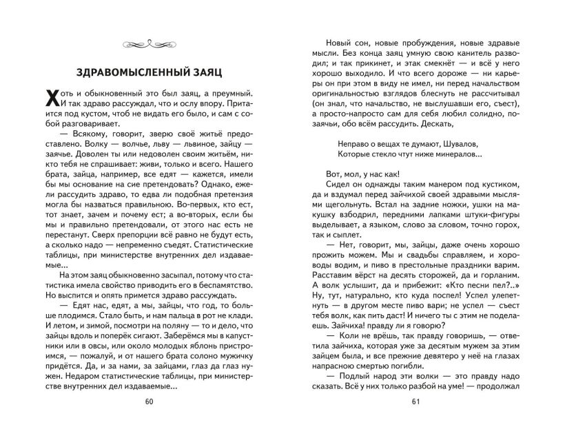 В сборник рассказов и сказок Михаила Салтыкова-Щедрина вошли его известные произведения «Повесть о том, как один мужик двух генералов прокормил», «Дикий помещик», «Премудрый пискарь», «Карась-идеалист», «Орёл-меценат» и другие, входившие в сборник «Сказки для детей изрядного возраста». Сатира Салтыкова-Щедрина не теряет актуальности и в наше время.