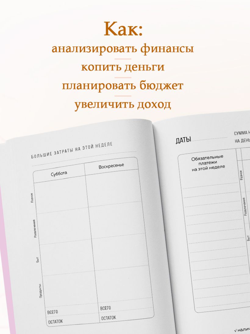Научитесь планировать свой бюджет и откладывайте деньги на исполнение своих желаний! С нашим ежедневником вы сможете проанализировать свои финансы, научитесь копить деньги и сможете увеличить свой доход! Функциональная сетка расходов, в которой вы сможете записывать и анализировать свои траты по различным категориям, планировать бюджет на будущий месяц и подводить итоги. Ведите учет расходов и доходов и наблюдайте за своими успехами! С помощью удобного и простого графика вы поставите финансовые планы и цели на год, а полезный трекер и подсказки помогут вам достичь всех целей и накопить деньги.