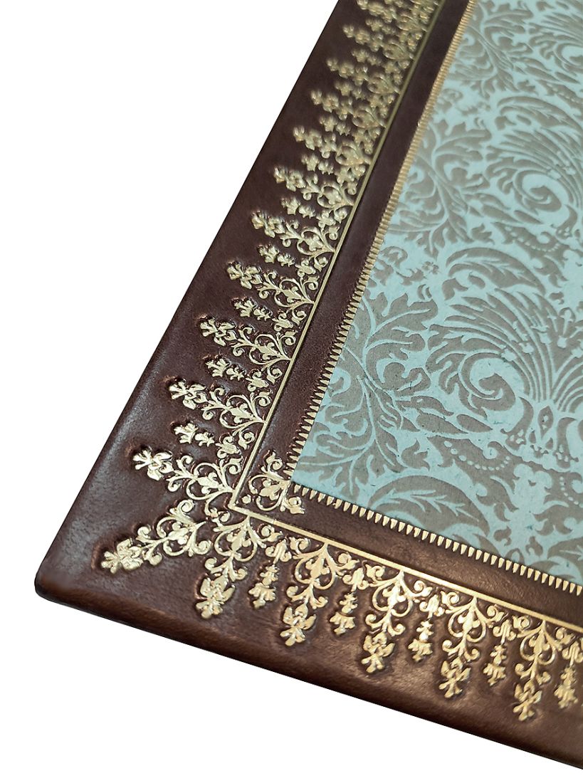Коллекционный переплет из натуральной гладкой кожи коньячного цвета украшен орнаментальным рельефным тиснением в стиле XVIII века. Передняя сторонка украшена орнаментальной плетеной рамкой со множеством окошечек, а в каждом из них тисненное золотом изображение монеты — всего их 24, всех времен и стран, древних и современных. Переплет книги создан мастером высокой квалификации. Обрез окрашен, торшонирован и вызолочен вручную. Каптал и ляссе (ленточка для закладывания страниц) изготовлены из шелка. Бумага в книге белая, матовая.