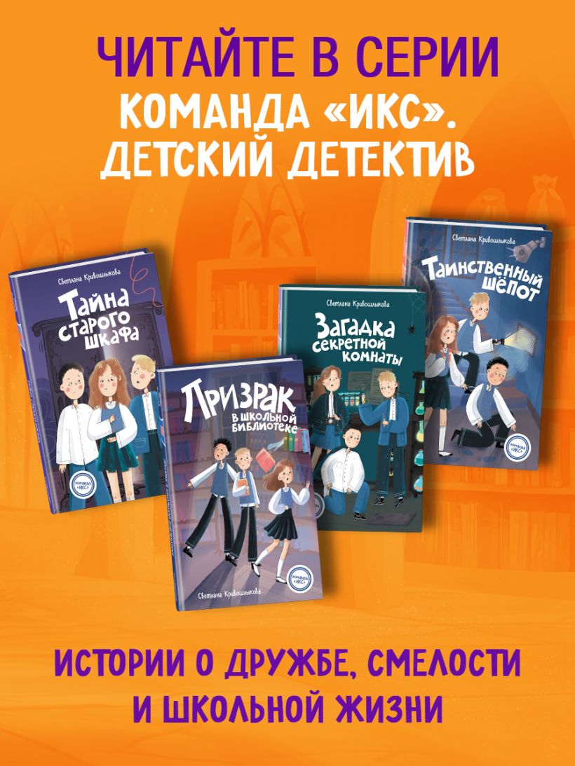 Новая детективная серия для поклонников «Чёрного котёнка» и «Мейзи Хитчинс»! Добро пожаловать в школу-пансион с вековой историей, где за старинными стенами скрываются самые необычные тайны! Трое друзей — Илья, Кира и Сашка — объединяются в команду «ИКС», чтобы расследовать загадочные события. Они учатся, дружат, ссорятся и мирятся… а ещё — берутся за дела, от которых даже у учителей бегут мурашки! Когда Кира и её друзья из команды «ИКС» находят в школе потайную лабораторию купца Платонова, они становятся героями дня. Но не для всех. Таня, Лера и Оля — старшеклассницы, привыкшие быть в центре внимания, — не собираются мириться с тем, что новенькая затмила их. Всё начинается с мелких пакостей: кражи еды, насмешек, подколов. Но вскоре Киру обвиняют в разбитом окне, и теперь ей грозит исключение. Отец, строгий офицер ФСБ, уже едет в школу… Тем временем старый шкаф в учительской скрывает нечто большее, чем просто полки. Действие историй разворачивается в уникальном месте — школе-пансионе, расположенном в бывшей купеческой усадьбе девятнадцатого века. Автор серии Светлана Кривошлыкова мастерски описала загадочную атмосферу старинного здания и тайны, хранящиеся в нём. Соединение духа закрытого пансиона с современной жизнью обычных школьников делает чтение увлекательным, а раскрытие тайн — запоминающимся. История внутри каждой книги закончена: одна книга — одна загадка. Книги серии можно читать как отдельно друг от друга, так и вместе. Книги рассчитаны на детей от 8 лет и старше. Подойдут для внеклассного чтения. Ребёнок не устанет читать: в книгах крупный шрифт, белая бумага, запоминающееся оформление.