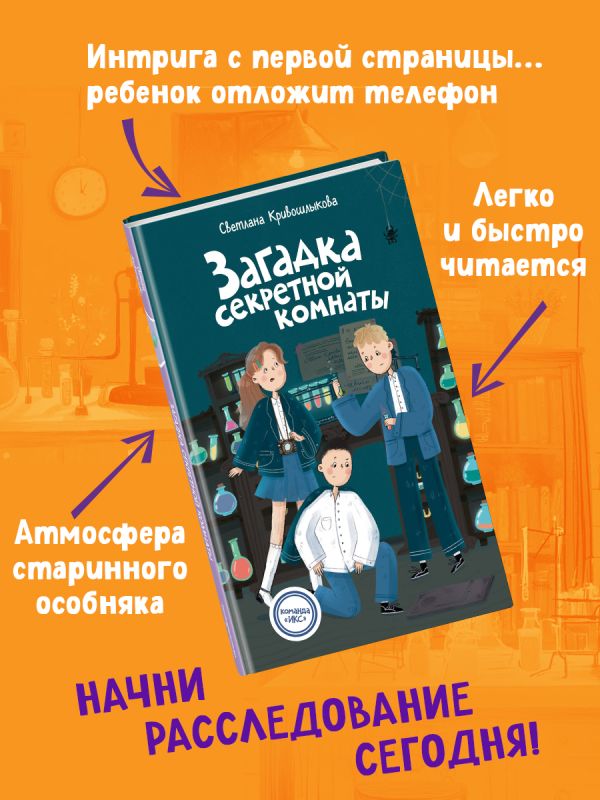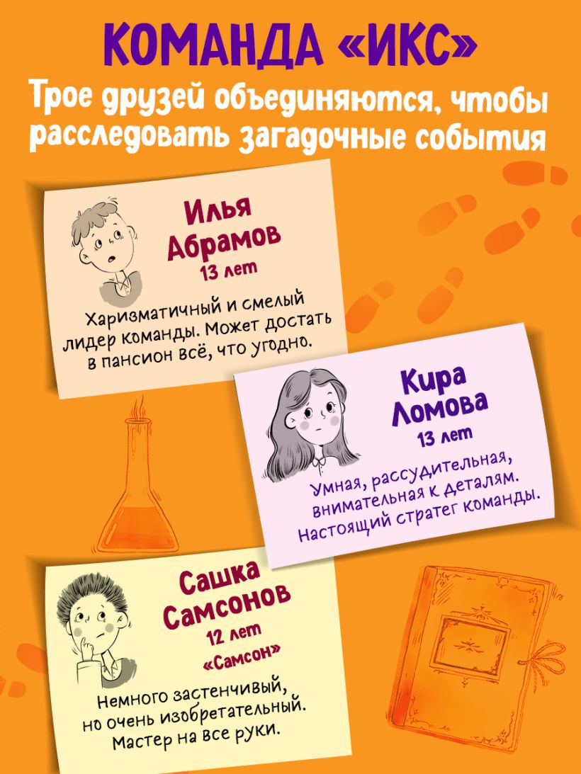 Новая детективная серия для поклонников «Чёрного котёнка» и «Мейзи Хитчинс»! Добро пожаловать в школу-пансион с вековой историей, где за старинными стенами скрываются самые необычные тайны! Трое друзей — Илья, Кира и Сашка — объединяются в команду «ИКС», чтобы расследовать загадочные события. Они учатся, дружат, ссорятся и мирятся… а ещё — берутся за дела, от которых даже у учителей бегут мурашки! В школьной библиотеке старинного пансиона происходит что-то странное: книги падают сами по себе, тени мелькают среди стеллажей, а сотрудники слышат загадочные голоса. Кто-то говорит о призраке, кто-то считает это глупым розыгрышем. Трое друзей: Илья, Кира и Сашка, вооружившись диктофоном, камерой и желанием раскрыть тайну, начинают своё первое расследование. Действие историй разворачивается в уникальном месте — школе-пансионе, расположенном в бывшей купеческой усадьбе девятнадцатого века. Автор серии Светлана Кривошлыкова мастерски описала загадочную атмосферу старинного здания и тайны, хранящиеся в нём. Соединение духа закрытого пансиона с современной жизнью обычных школьников делает чтение увлекательным, а раскрытие тайн — запоминающимся. История внутри каждой книги закончена: одна книга — одна загадка. Книги серии можно читать как отдельно друг от друга, так и вместе. Книги рассчитаны на детей от 8 лет и старше. Подойдут для внеклассного чтения. Ребёнок не устанет читать: в книгах крупный шрифт, белая бумага, запоминающееся оформление.
