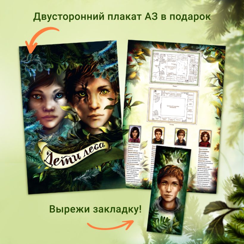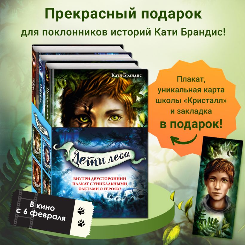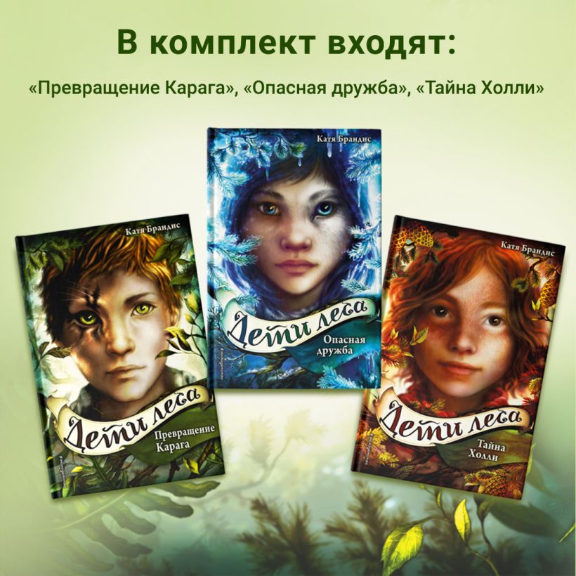 В комплект входят первая, вторая и третья книги серии «Дети леса»: «Превращение Карага», «Опасная дружба», «Тайна Холли». Внутри вы найдете двусторонний плакат с изображением героев, их описанием и уникальными картами школы «Кристалл».