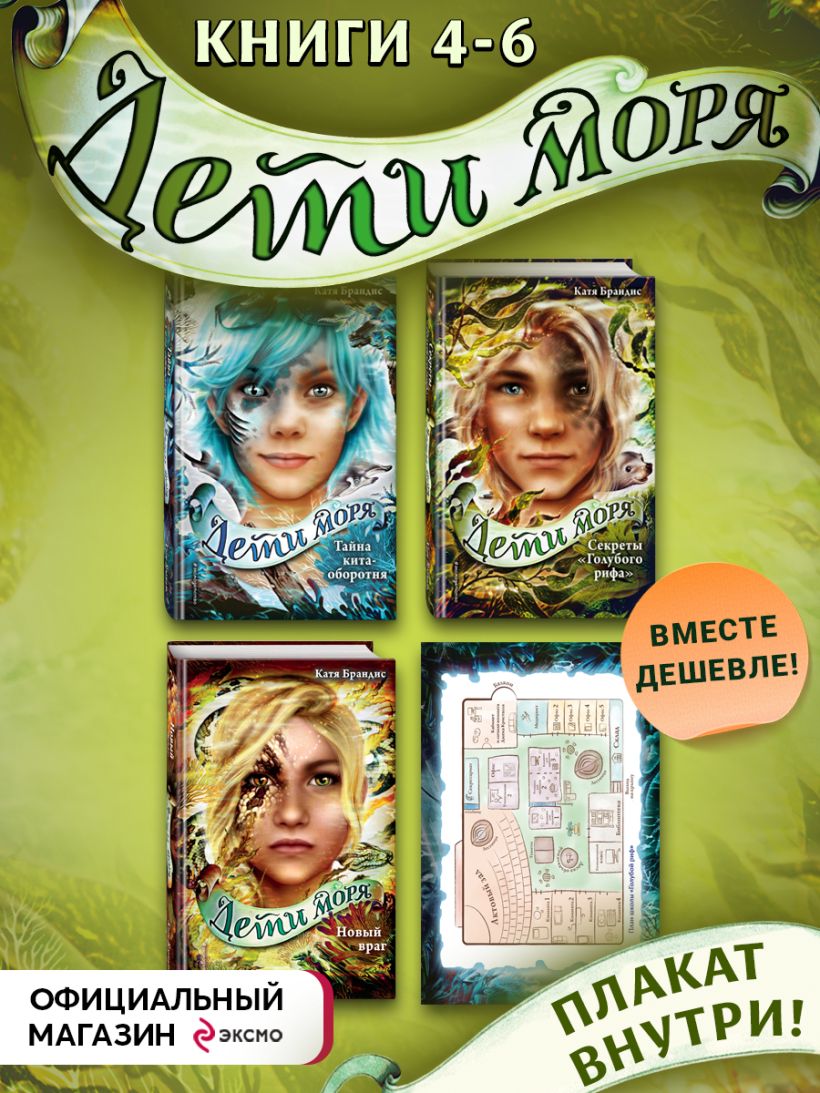 Комплект из трёх книг серии-продолжения «Дети моря»! Внутри уникальные плакаты с анкетами героев и картами школы «Голубой риф». Прекрасный подарок для поклонников историй Кати Брандис!