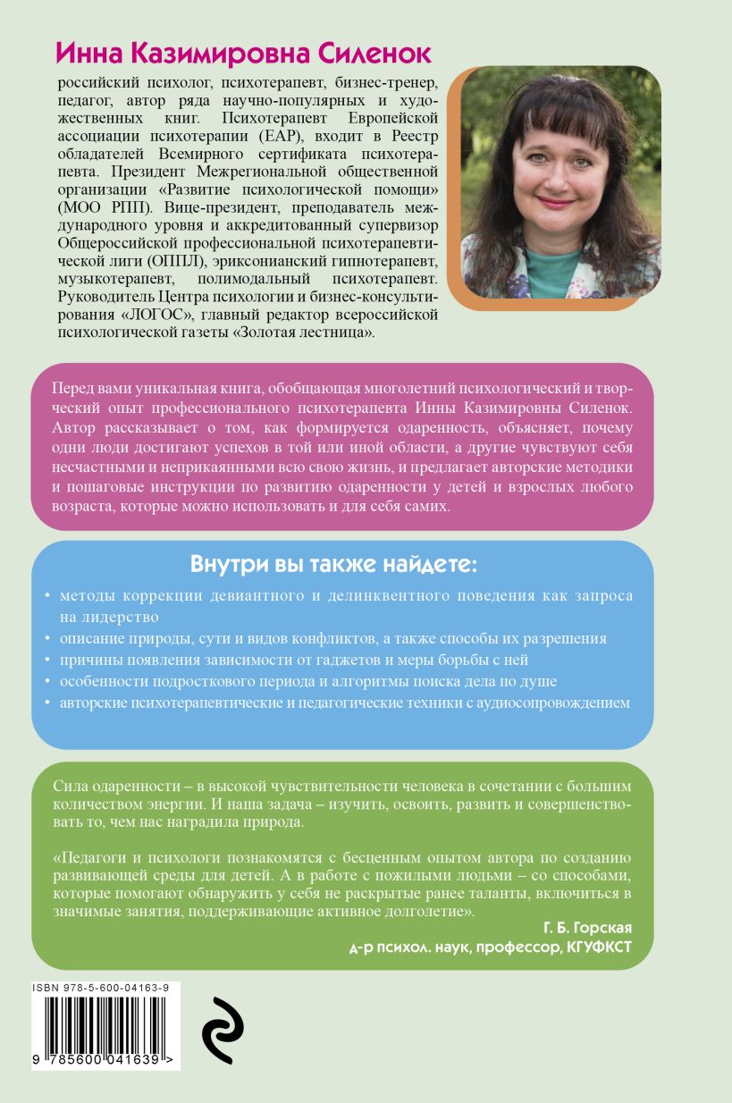 ВОСПИТЫВАЕМ ВУНДЕРКИНДА: Перед вами уникальная книга, обобщающая многолетний психологический и творческий опыт профессионального психотерапевта Инны Казимировны Силенок. Автор рассказывает о том, как формируется одаренность, объясняет, почему одни люди достигают успехов в той или иной области, а другие чувствуют себя несчастными и неприкаянными всю свою жизнь, и предлагает авторские методики и пошаговые инструкции по развитию одаренности у детей и взрослых любого возраста, которые можно использовать и для себя самих.