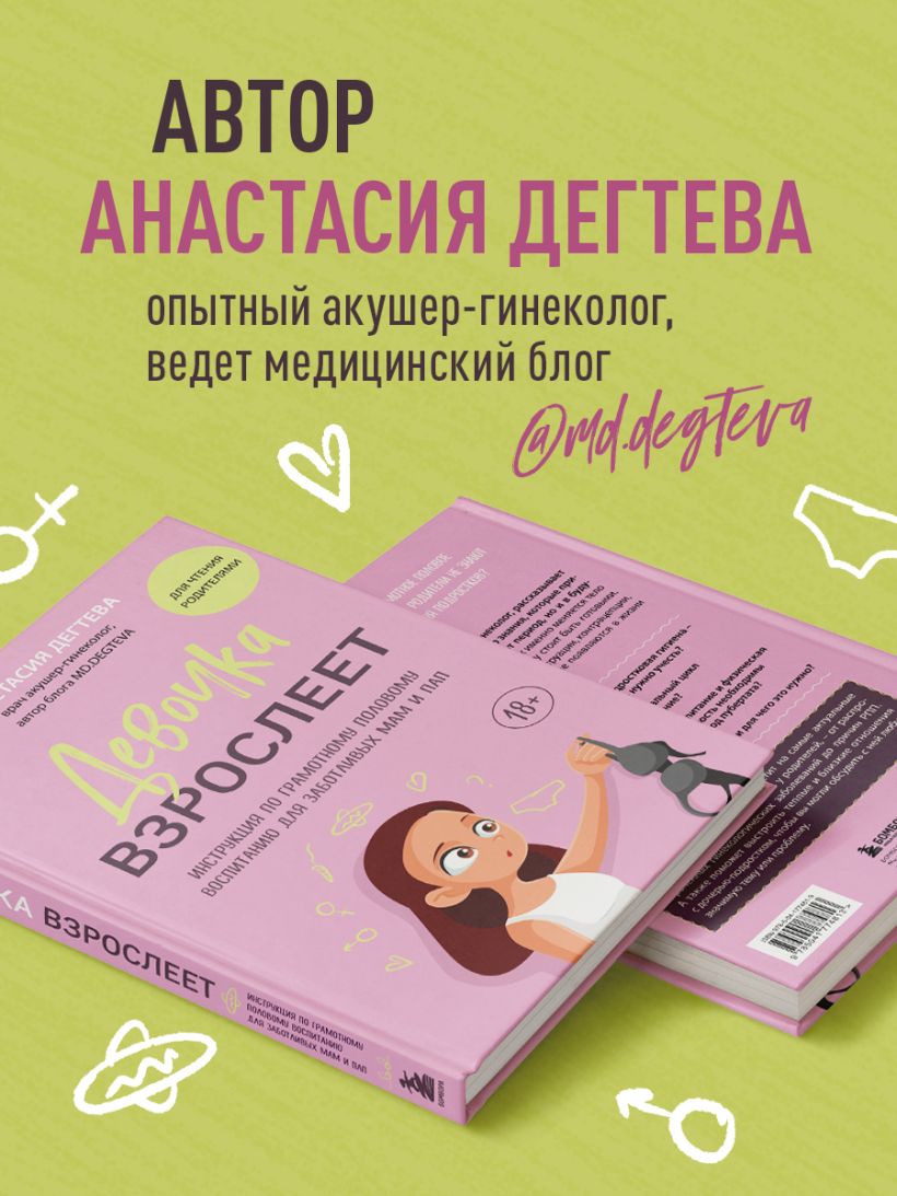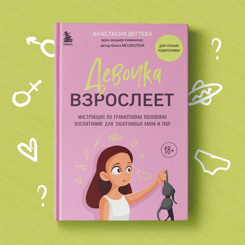 Гинеколог Анастасия Дегтева в книге «Девочка взрослеет» рассказывает, какие этапы взросления проходит каждая девочка и какие знания могут пригодиться ей в этот период, а также в будущем. Книга объяснит родителям, как именно меняется тело и психика в подростковом возрасте и к чему стоит быть готовыми. Подскажет, с чего начать разговор о менструации, контрацепции, отношениях и других новых вещах, которые появляются в жизни взрослеющей девочки.
