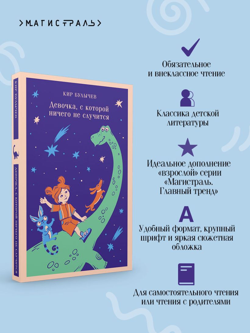"Девочка, с которой ничего не случится" - это произведение о мире фантастики и мире приключений. Главная героиня повести —.Алиса, идет в школу, в первый класс. Алиса обладает не только необычайным воображением, но и способностью находить выход из самых сложных и опасных ситуаций. Её оптимизм и жизнерадостность помогают ей заводить новых друзей (даже бронтозавров) и переживать удивительные приключения, полные чудес и открытий.