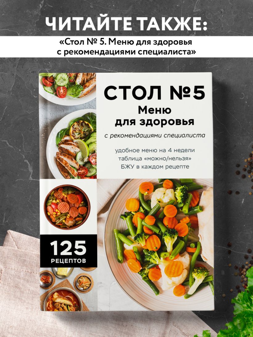 Что важно для всех читающих эту книгу. «Стол № 5» — довольно общее понятие. В него входят два основных раздела — «собственно стол № 5», который рекомендуют при заболеваниях печени, желчного пузыря, желчевыводящих путей и панкреатите вне стадии обострения, и «стол № 5а», который прописывают при хроническом панкреатите. Так как заболеваний печени и сопутствующих органов на свете существует много, нужно обязательно посоветоваться со своим лечащим врачом — какой именно вариант он вам посоветует и на какие блюда при составлении диеты обратить особое внимание. В этой книге вы найдете список продуктов, которые можно и которые нельзя употреблять при определенных заболеваниях, рекомендации по их обработке и нарезке. «Стол № 5» подразумевает частое питание небольшими порциями. Обычно назначают 5 приемов пищи в день, из которых два или три могут состоять только из одного блюда. Поэтому в книге дано меню на 4 недели, созданное из блюд, представленных в ней. А также приведена таблица по КБЖУ каждого важного продукта. И, конечно, рецепты, их более ста. Надеемся, книга станет полезным помощником тем людям, у которых уже есть проблемы со здоровьем, а также тем, кто хочет оставаться здоровым как можно дольше.