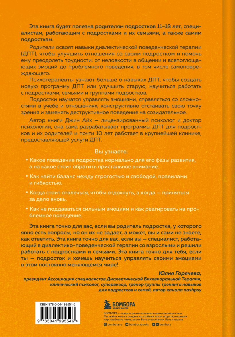 «Эта книга точно для тебя, если ты — подросток и хочешь научиться управлять своими эмоциями в этом постоянно меняющимся мире! Эта книга точно для вас, если вы родитель подростка, у которого явно есть вопросы, но он их не задает, а может, вы и сами не знаете, как ответить. Эта книга точно для вас, если вы — специалист, работающий в диалектико-поведенческой терапии со взрослыми и решили работать с подростками и семьями.