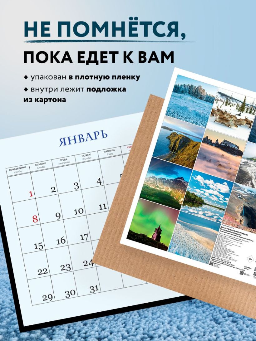 Благодаря большому формату и высокому качеству изображений этот календарь может стать отличным дополнением интерьера. В нем также отмечены выходные дни, а просторная сетка позволяет удобно планировать время и записывать важные события.