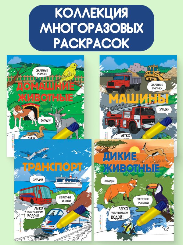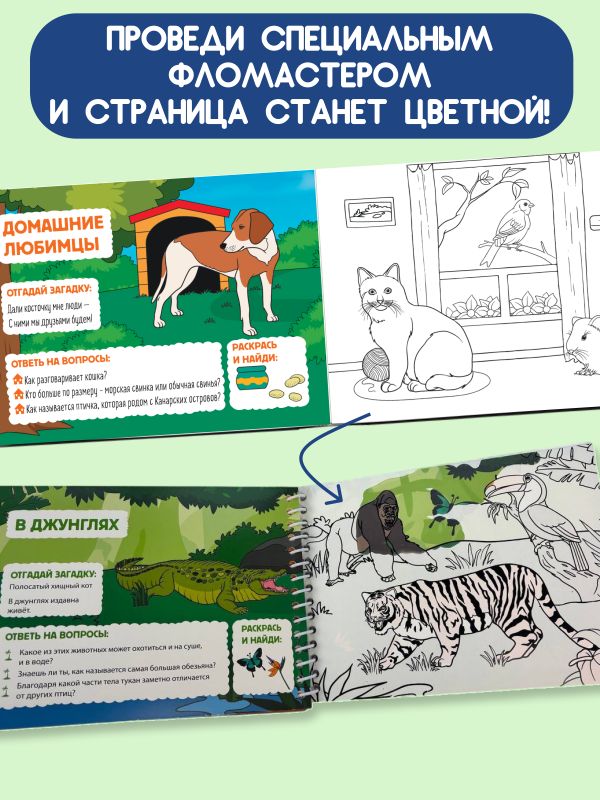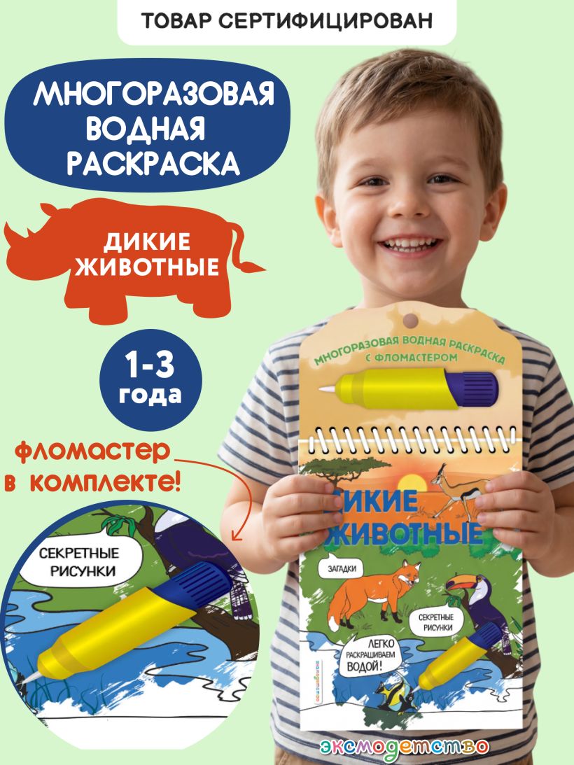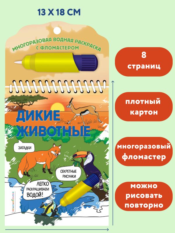 Представляем новое поколение раскрасок! Во-первых, вам больше не нужны цветные карандаши или фломастеры. Просто наполните специальный фломастер, входящий в комплект, водой и проведите им по страницам — они сразу же станут цветными. Поэтому раскраской смогут пользоваться даже самые маленькие дети, только начинающие держать ручку. Во-вторых, эта раскраска многоразовая. После высыхания страницы из прочного картона снова станут чёрно-белыми, и их можно раскрашивать повторно. В-третьих, эта раскраска развивающая: на каждом развороте есть задания на внимание и мышление, стихотворные загадки и даже скрытые предметы, появляющиеся из ниоткуда! Раскрашивая реалистичные иллюстрации, ваш малыш с интересом познакомится с разными видами диких животных.