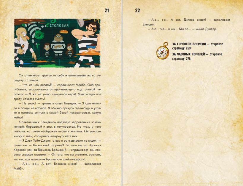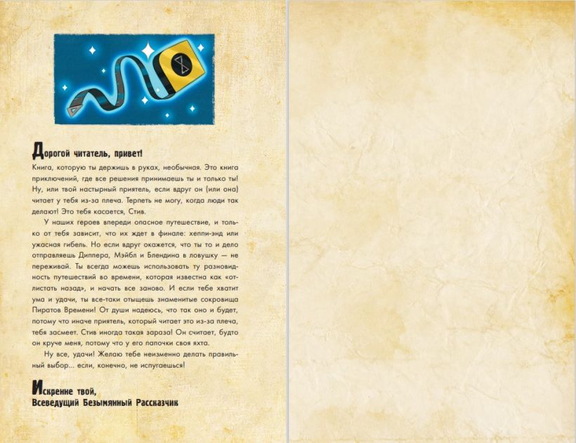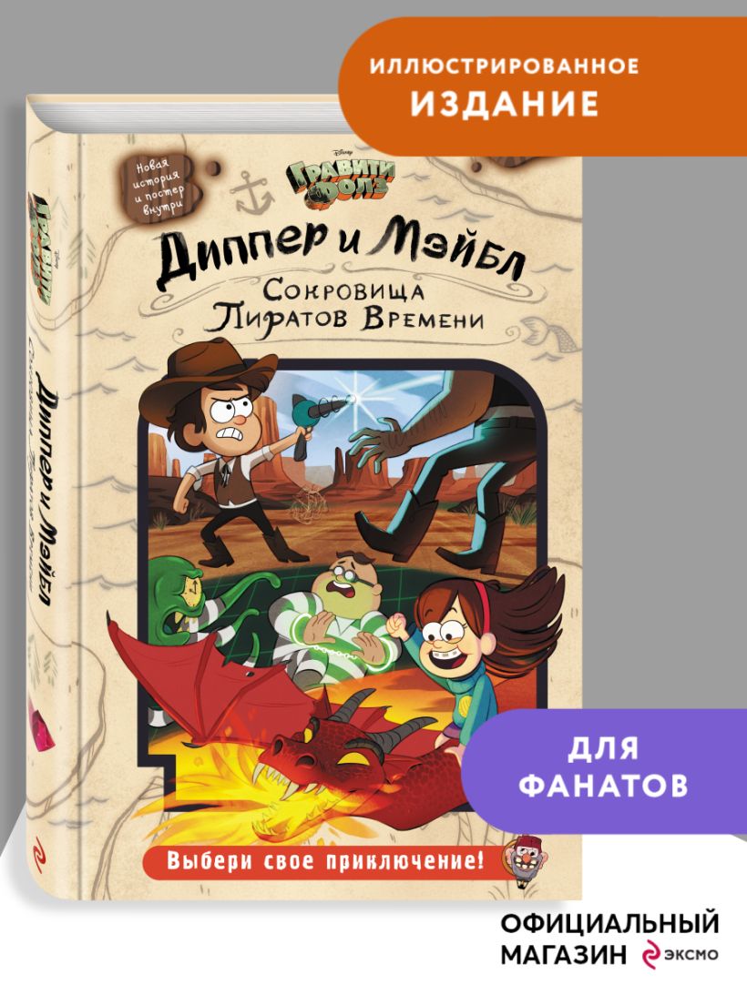 Диппер и Мэйбл вместе с путешественником во времени Блендином Блэндином отправляются на поиски сокровищ Пиратов Времени. Их ждут головокружительные и опасные приключения в будущем и в прошлом: на Диком Западе и в Средневековье. Но именно ты выбираешь, куда друзья отправятся дальше и что предпримут, будут ли они грабить поезд, как заправские бандиты из вестерна, или встретятся с драконом в пещере. Только осторожнее, ведь ты можешь привести близнецов не только к сокровищам, но и туда, откуда нет выхода, например, во временной тупик.