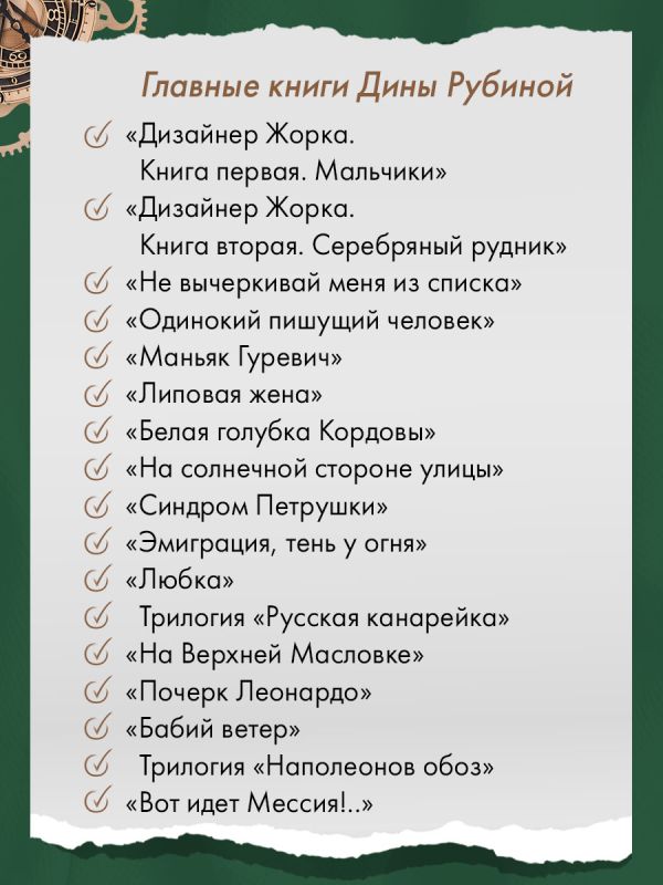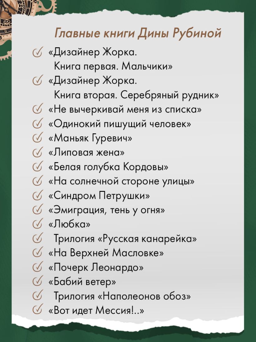 Дина Рубина — современный прозаик, лауреат российской премии «Большая книга». Ее романы и рассказы не раз были экранизированы.