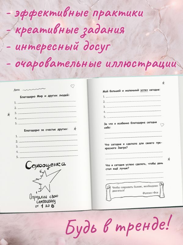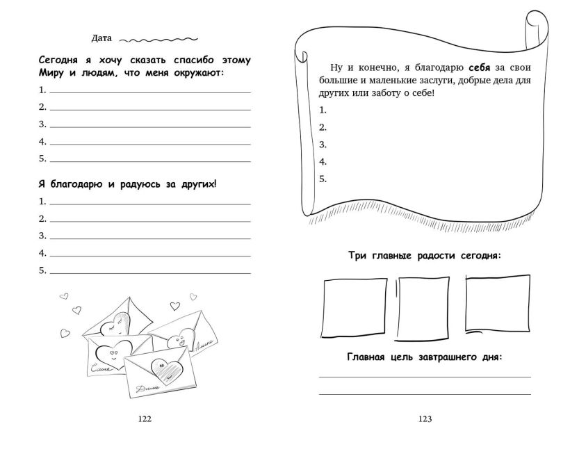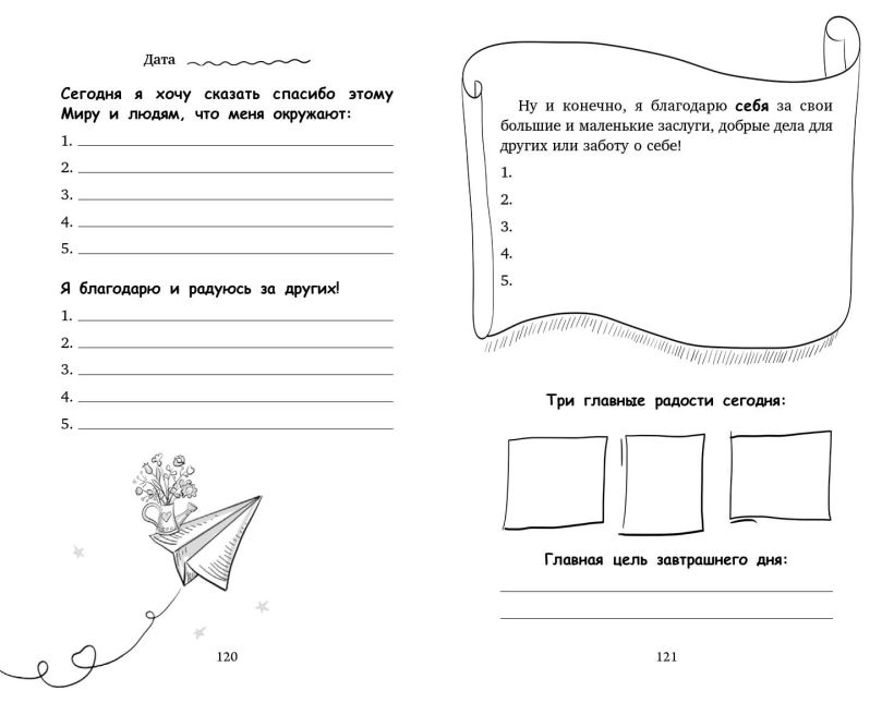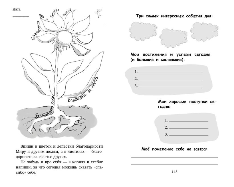 Как развить свой творческий потенциал? Ответ один: «День за днём хвали себя за успехи, отмечай вещи, за которые нужно поблагодарить мир, принимай и осмысляй неудачи и поражения. Так ты незаметно научишься относиться к себе более чутко, поймёшь, чего ты хочешь на самом деле — именно ты! — и как планомерно добиваться выполнения своих желаний». Все это можно практиковать на увлекательных заданиях, тщательно проработанных специалистом по детской психологии, в «Дневнике благодарности и успехов»! Более того, в нем можно не только писать, но и раскрашивать очаровательные чёрно-белые иллюстрации! И, конечно, большая роль в этом процессе развития отведена родителям, они несомненно должны оказать поддержку ребенку, чтобы он с самого начала обрел уверенность в себе.
