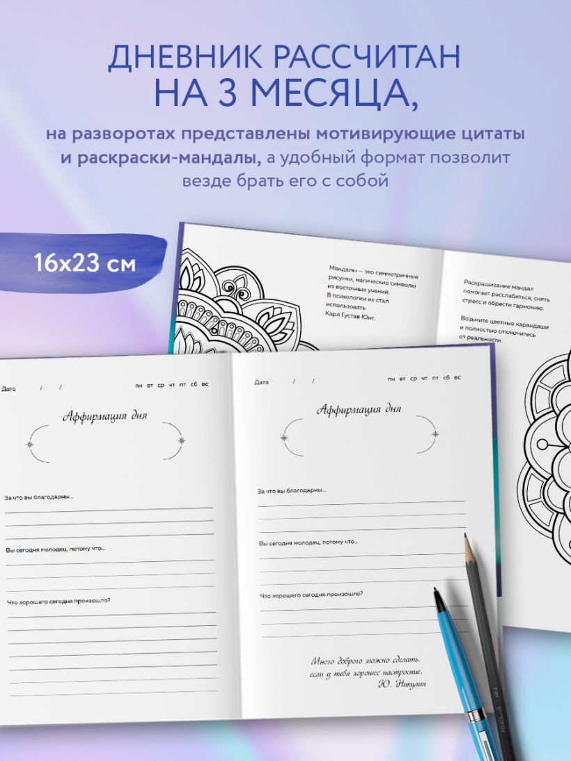 Дневник рассчитан на 3 месяца, на разворотах представлены мотивирующие цитаты, а удобный формат (16x23 см) позволит везде брать его с собой. Подходит для подарка.