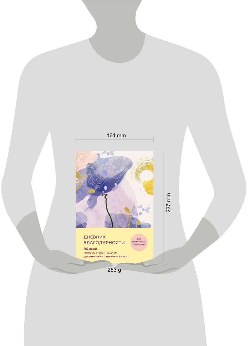 Изменить свою жизнь возможно. Нужно только желание и 5 минут в день! Дневник благодарности — это ежедневная практика любви к себе и миру. Наводящие вопросы и блок для аффирмаций — позитивных установок, помогут выработать привычку видеть хорошее вокруг. Порой стоит притормозить в ежедневной гонке и заметить маленькие радости: чашечка ароматного кофе утром, теплый ветерок в волосах, потрескивание дров в камине или шлейф любимого парфюма. За 90 дней вы: - вспомните свои успехи и вдохновитесь на новые; - научитесь выносить позитив даже из сложных ситуаций; - заведете список приятных мелочей; - раскрасите яркими цветами страницы (и свою жизнь). Дневник рассчитан на 3 месяца, на разворотах представлены мотивирующие цитаты, а удобный формат (16x23 см) позволит везде брать его с собой.