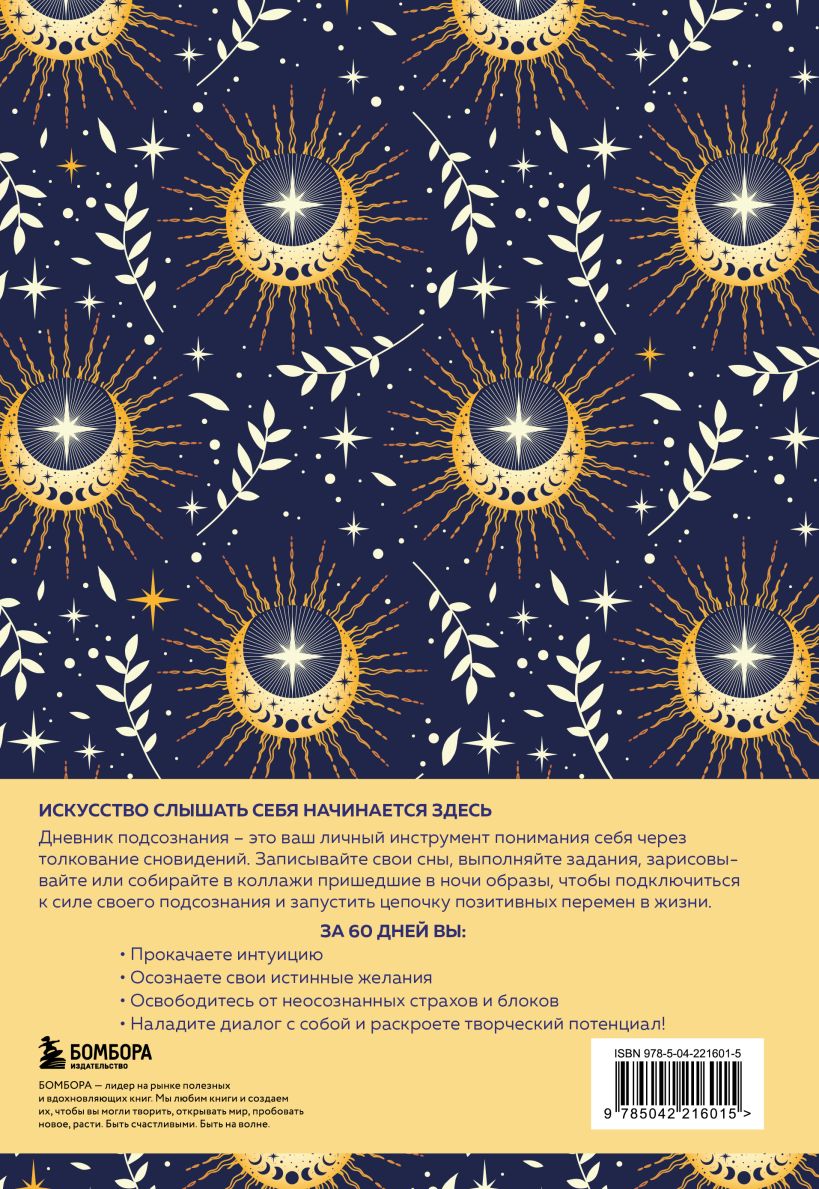 ИСКУССТВО СЛЫШАТЬ СЕБЯ НАЧИНАЕТСЯ ЗДЕСЬ. Дневник подсознания — это ваш личный инструмент понимания себя через толкование сновидений. Записывайте свои сны, выполняйте задания, зарисовывайте или собирайте в коллажи пришедшие в ночи образы, чтобы подключиться к силе своего подсознания и запустить цепочку позитивных перемен в жизни. ЗА 60 ДНЕЙ ВЫ: - Прокачаете интуицию. - Осознаете свои истинные желания. - Освободитесь от неосознанных страхов и блоков. - Наладите диалог с собой и раскроете творческий потенциал! Начните заполнять ваш гид по внутреннему миру, который поможет находить нестандартные решения и жить в гармонии со своим «Я». Дневник рассчитан на 2 месяца, внутри вы найдете задания для самопознания и тематическую раскраску. А удобный формат (16x23 см) и мягкая обложка позволяют брать его с собой. Всего представлено два оформления: розовый туман и солнечный блеск.