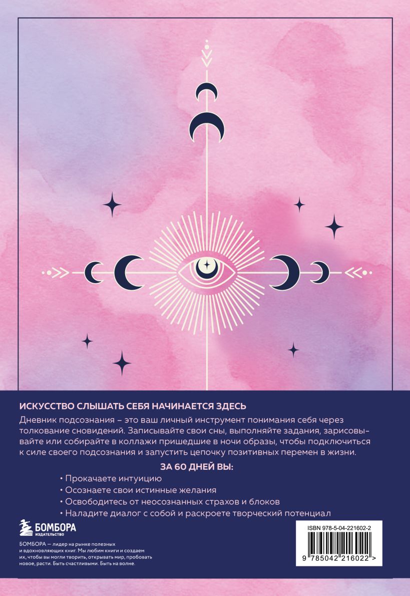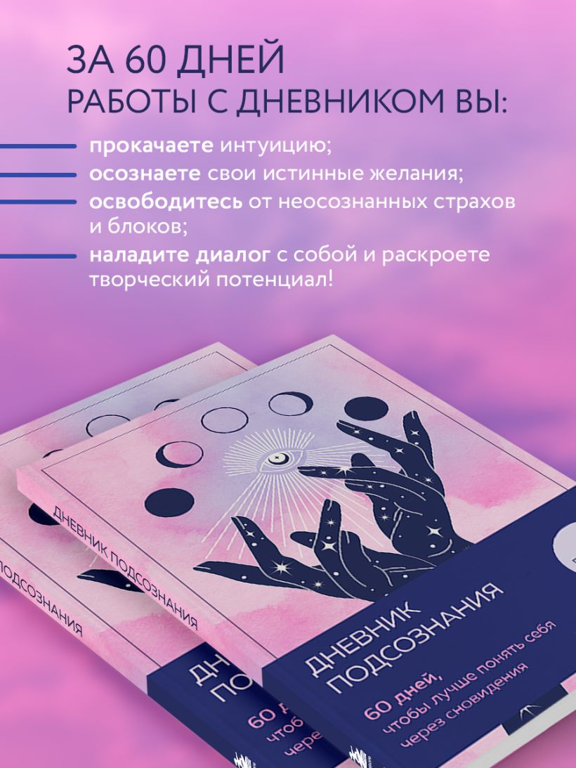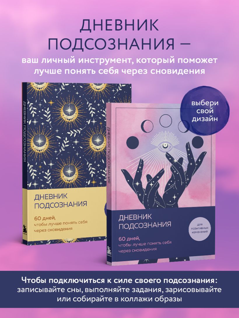 ИСКУССТВО СЛЫШАТЬ СЕБЯ НАЧИНАЕТСЯ ЗДЕСЬ. Дневник подсознания — это ваш личный инструмент понимания себя через толкование сновидений. Записывайте свои сны, выполняйте задания, зарисовывайте или собирайте в коллажи пришедшие в ночи образы, чтобы подключиться к силе своего подсознания и запустить цепочку позитивных перемен в жизни. ЗА 60 ДНЕЙ ВЫ: - Прокачаете интуицию. - Осознаете свои истинные желания. - Освободитесь от неосознанных страхов и блоков. - Наладите диалог с собой и раскроете творческий потенциал! Начните заполнять ваш гид по внутреннему миру, который поможет находить нестандартные решения и жить в гармонии со своим «Я». Дневник рассчитан на 2 месяца, внутри вы найдете задания для самопознания и тематическую раскраску. А удобный формат (16x23 см) и мягкая обложка позволяют брать его с собой. Всего представлено два оформления: розовый туман и солнечный блеск.