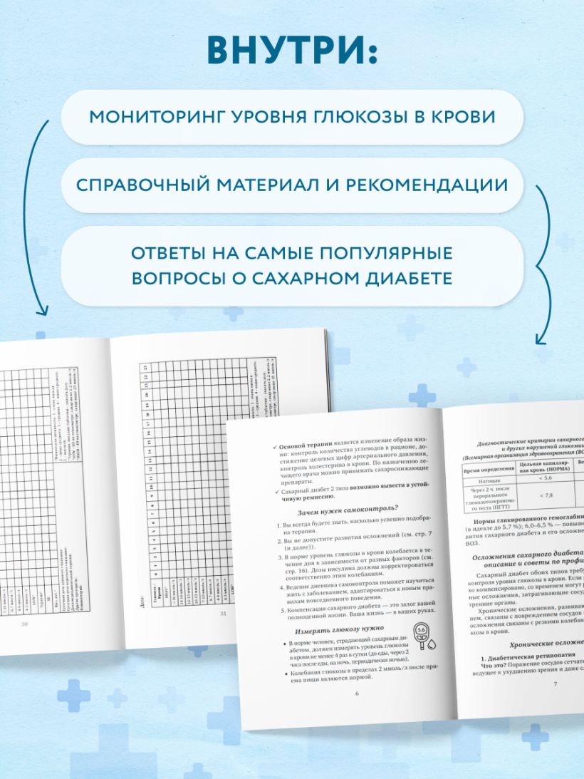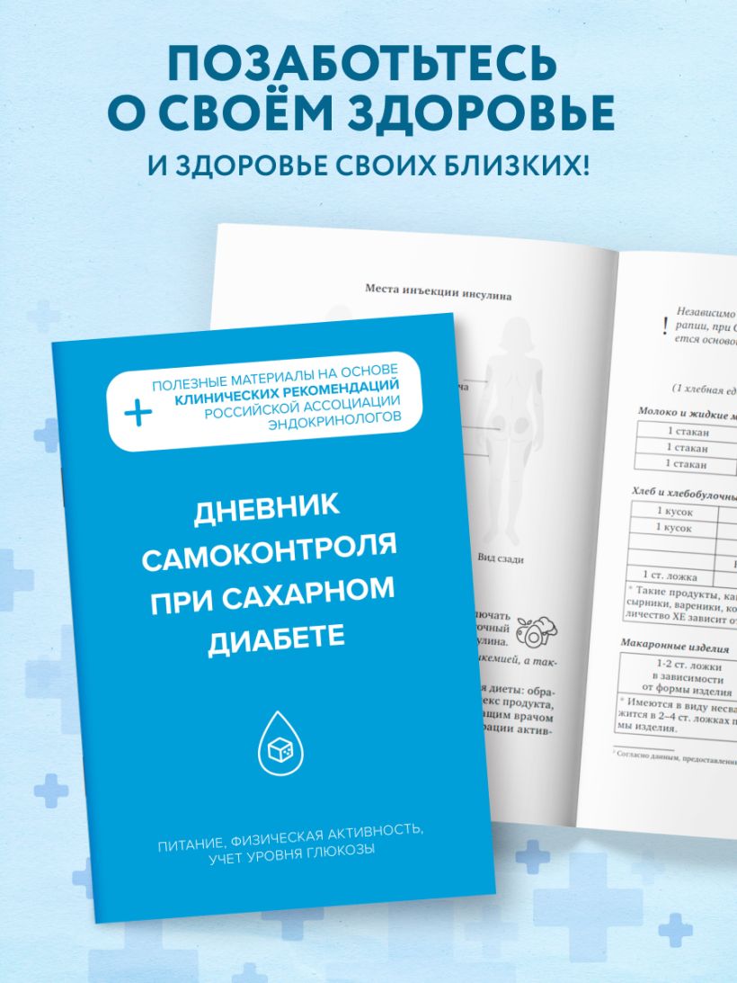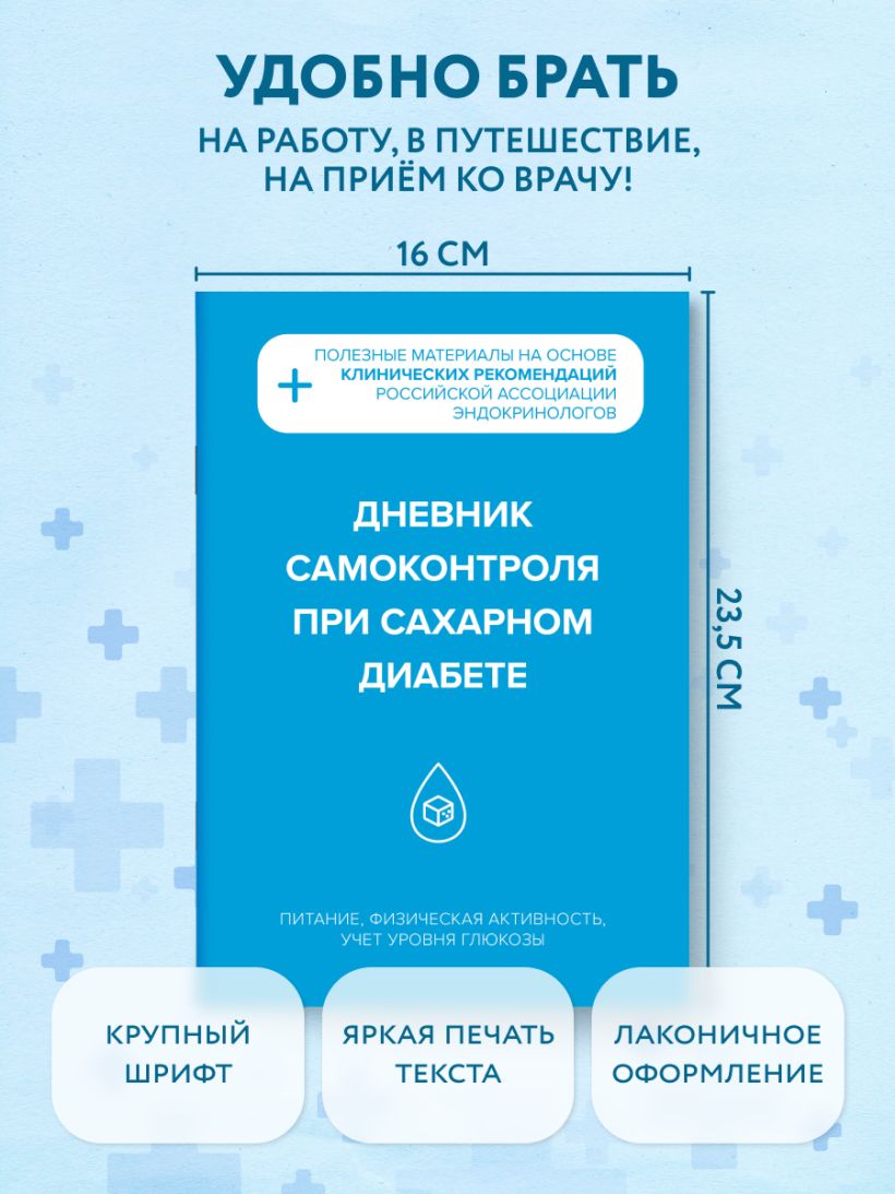 Простая и наглядная форма записей подойдёт как подросткам, так и взрослым. Дневник сочетает практичность ежедневника с актуальными медицинскими знаниями — ваш надёжный помощник в борьбе за стабильный уровень глюкозы!