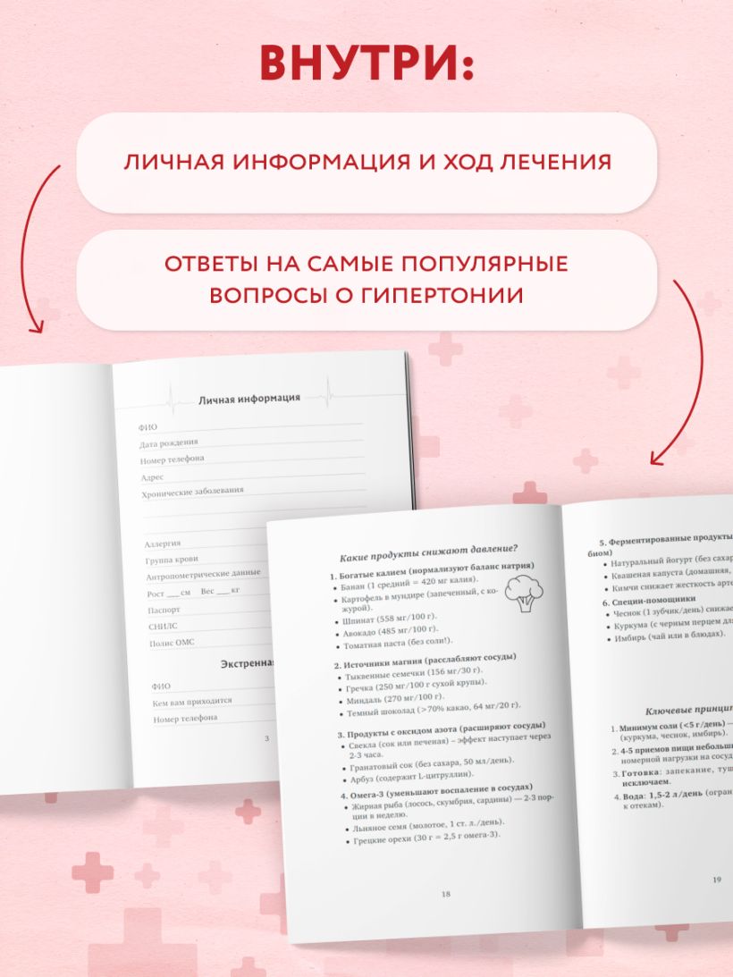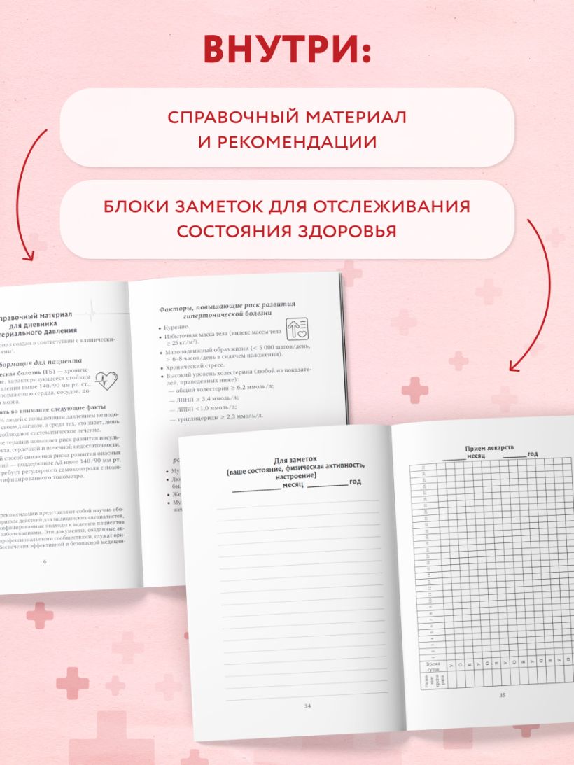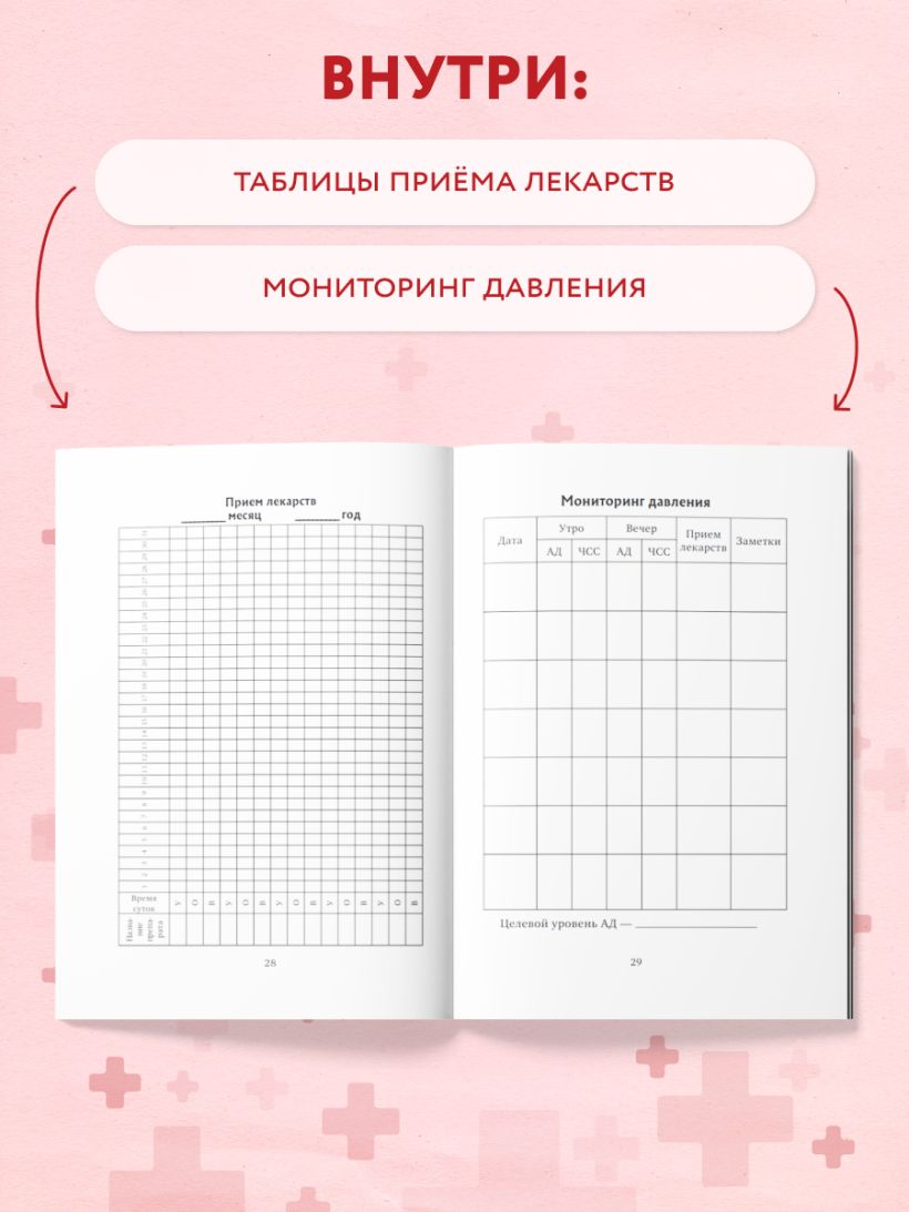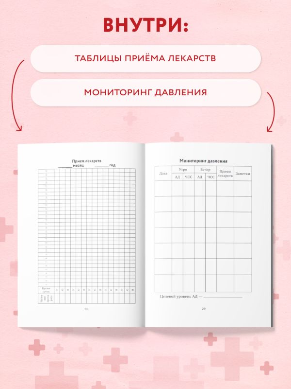 1. Удобные таблицы для ежедневного внесения результатов измерений (утро/вечер), приема лекарств и заметок о самочувствии.