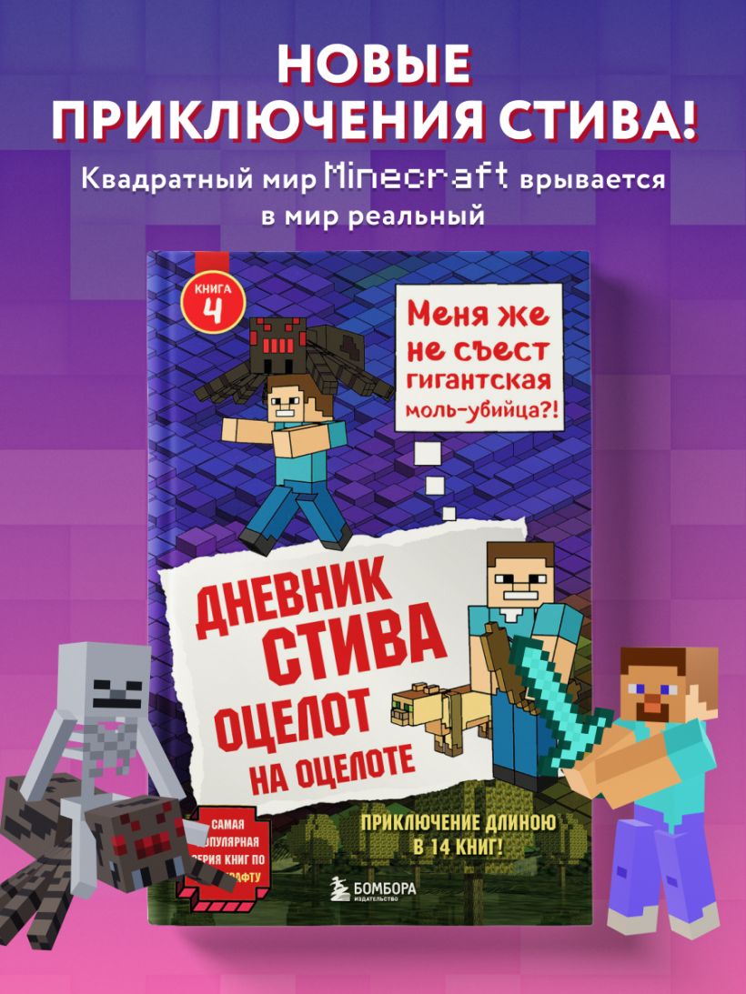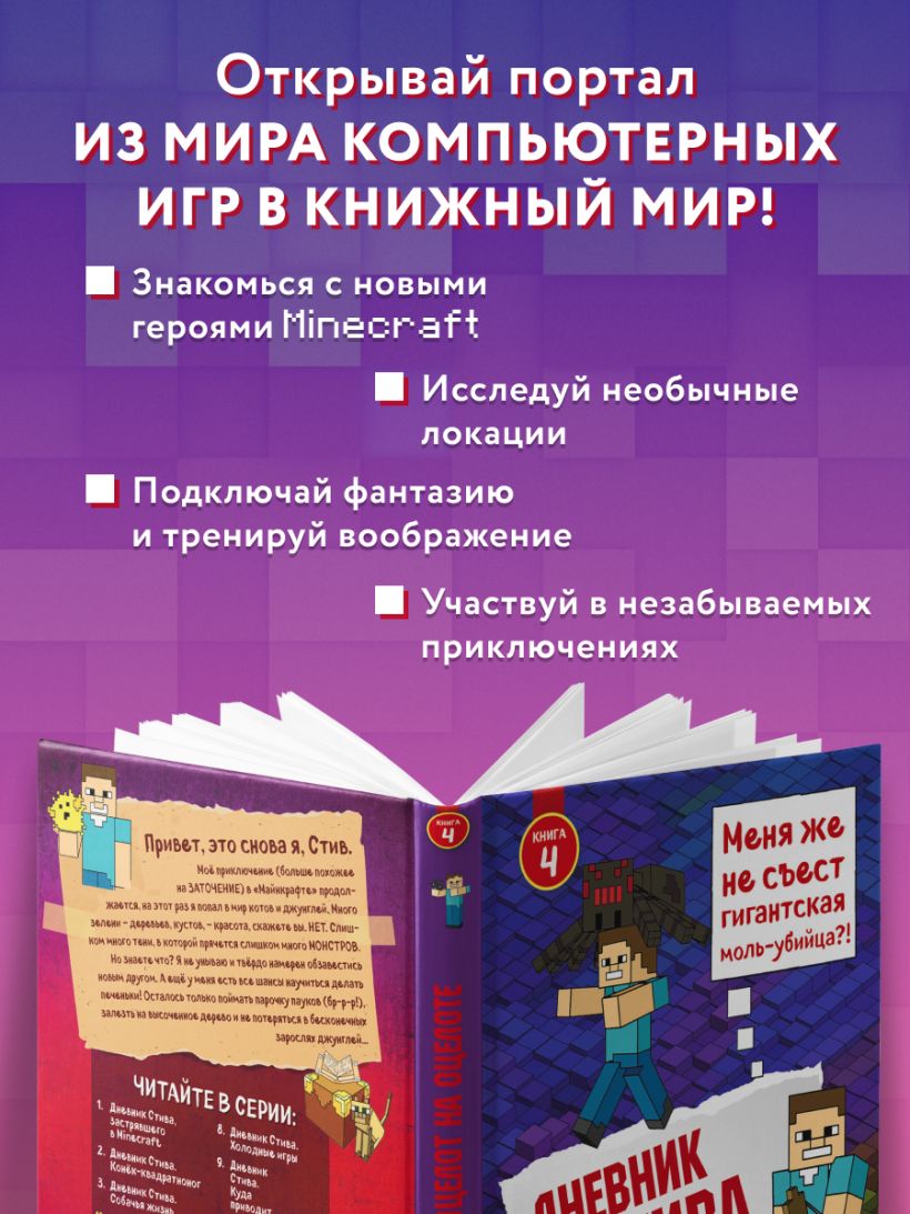 Ну вот, только я подумал, что мои приключения закончились, как снова оказался в мире Minecraft! Зато тут я встретил старого друга — пса по кличке Гудини. Он, как всегда, крут! Но чтобы помочь ему, мне пришлось изрядно постараться: броня для него — дело непростое, ведь добыть щиты от броненосцев оказалось настоящей головной болью! Но ничего, справились. А впереди нас ждали новые задания: найти вторую часть загадочного стихотворения Дирка (да-да, опять он тут все мутит) и продолжить свой путь. И как будто этого мало… теперь мне нужно достать ЛЕТАЮЩУЮ КНИГУ! Только вот беда — она почему-то оказалась… на поезде! И конечно, без прыжков с деревьев, драки с криперами, зомби и скелетами тут не обошлось. Но если ты хочешь узнать, что задумал хитрый Дирк, и как я справился со всеми испытаниями — читай дальше. Скучно точно не будет! Читайте в серии: 1. «Дневник Стива, застрявшего в Minecraft» 2. «Дневник Стива. Конёк-квадратноног» 3. «Дневник Стива. Собачья жизнь» 4. «Дневник Стива. Оцелот на оцелоте» 5. «Дневник Стива. Ушастая угроза» 6. «Дневник Стива. Секретные МУ-Утериалы» 7. «Дневник Стива. Стив, колдунья и наковальни» 8. «Дневник Стива. Холодные игры» 9. «Дневник Стива. Куда приводит портал» 10. «Дневник Стива. На суше и на море» 11. «Дневник Стива. Дом в тёмном лесу» 12. «Дневник Стива. Куда глаза летят» 13. «Дневник Стива. Визжащий в лабиринте» 14. «Дневник Стива. Крайний том» 15. «Дневник Стива. Остров невезения» 16. «Дневник Стива. Неожиданные встречи»