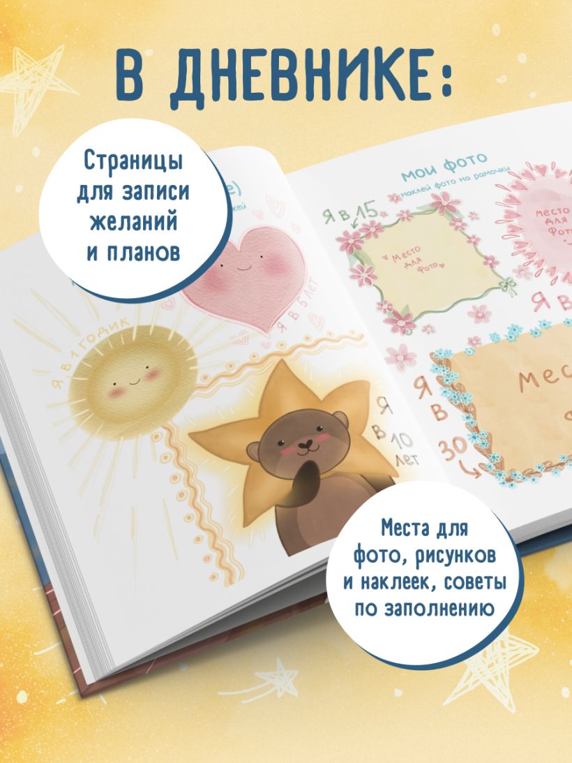 - Места для наклеек, фотографий и рисунков, чтобы сделать каждый дневник уникальным и индивидуальным.