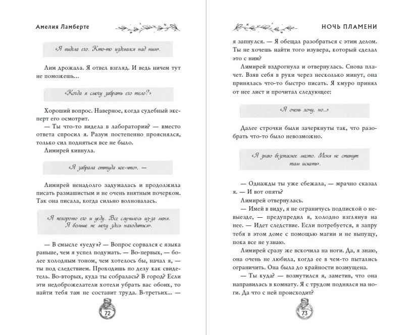 Хочется сказать отдельно про продуманность мира: вы сами можете прочувствовать масштабы благодаря карте. Главное — автор не обходит стороной интересные места, а позволяет разглядеть каждый закуток, насладиться садами, зданиями, помещениями, что, несомненно, создает объемную картинку, позволяет разыграться читательскому воображению. Автор умеет работать с флешбэками: не вываливает весь ушат информации на читателя, а постепенно выдает штрихами и мазками, которые сыграют свою роль в основной канве истории. Динамично и логично происходит расследование, а опасные догадки заставляют поволноваться: выберутся ли герои из очередной передряги? Кто сможет выжить?
