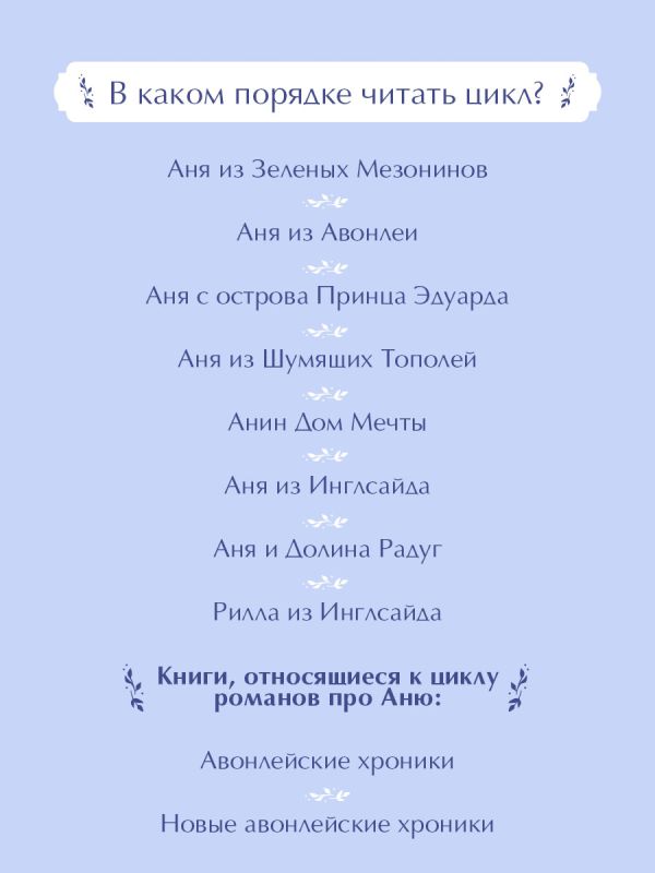 Романы об Ане Ширли — это классическая история взросления со взлётами и падениями, печалями и радостями. В 2017 году вышел очень душевный сериал «Энн», снятый по циклу романов об Ане.