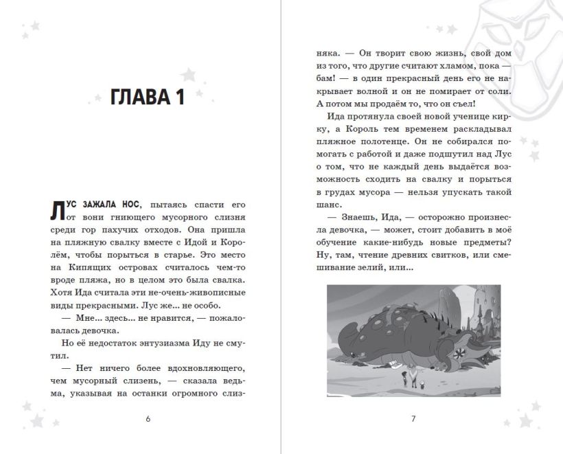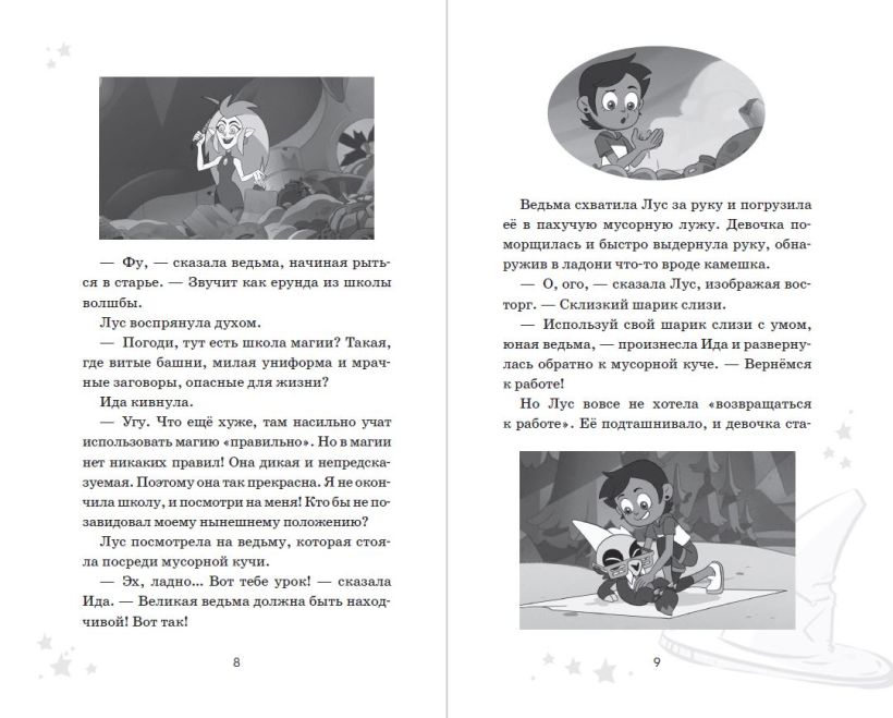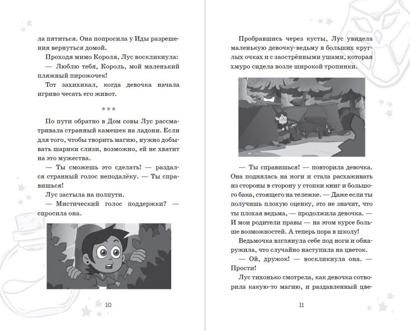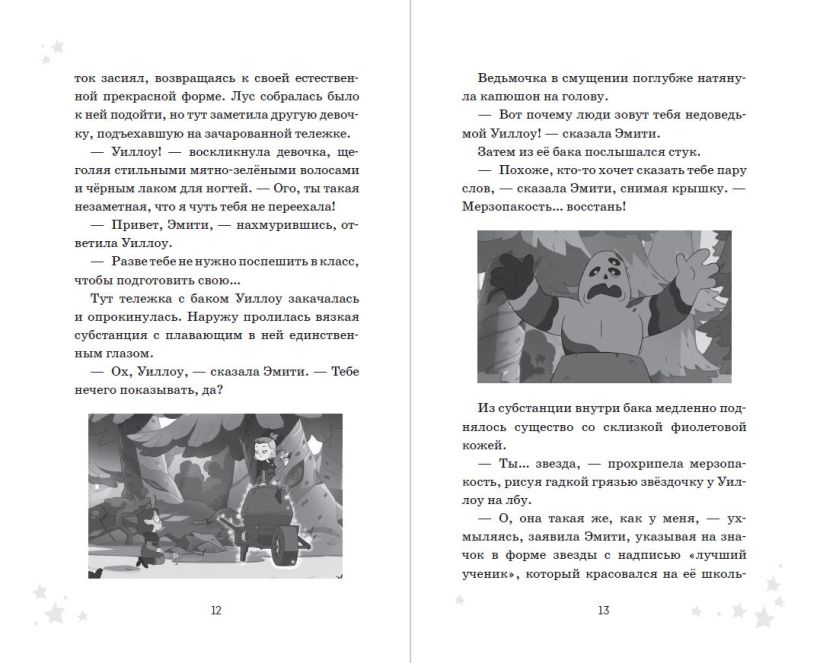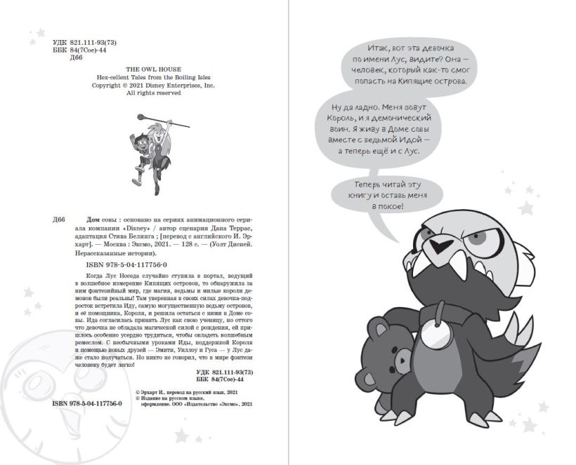Мультфильм «Дом совы» идёт на канале Disney с конца 2020 года и уже нашёл своих верных поклонников среди детей всех возрастов, а ещё он немного напоминает «Гравити Фолз» своими необычными героями, удивительным вымышленным миром и несравненным юмором. В этой книге вас ждёт пересказ двух серий из первого сезона сериала в сопровождении чёрно-белых иллюстраций из мультфильма. Магия в каждой снежинке, ведьмы, усыпляющие монстров, заклинания и зелья, которые оживляют овощи и игрушки, — вот такой он, фэнтезийный мир «Дома совы»!