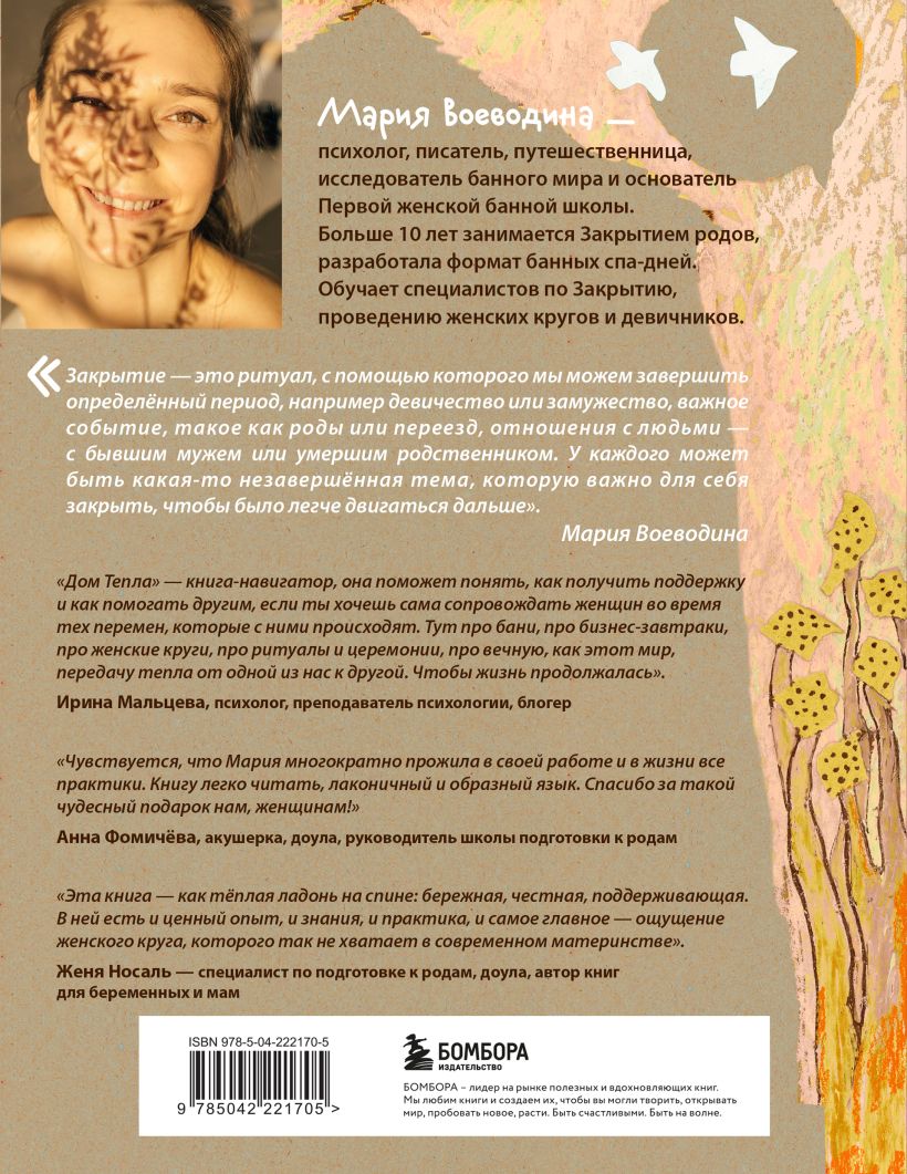 «Чувствуется, что Мария многократно прожила в своей работе и в жизни все практики. Книгу легко читать, лаконичный и образный язык. Спасибо за такой чудесный подарок нам, женщинам!» — Анна Фомичёва, акушерка, доула, руководитель школы подготовки к родам
