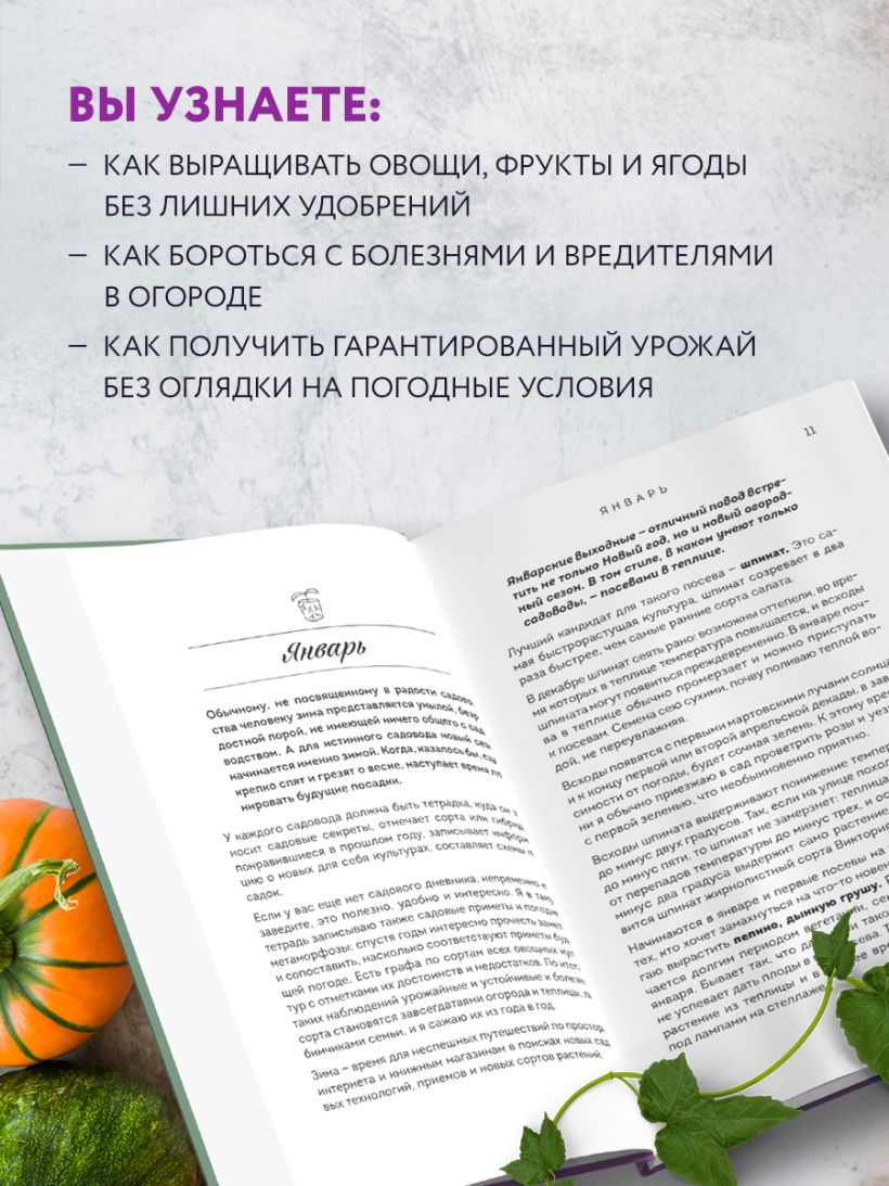 Как получить гарантированный урожай без оглядки на погодные условия? Как выращивать овощи, фрукты и ягоды без лишних удобрений? Как быстро и без затрат приготовить качественный компост? Светлана Самойлова — популярный блогер-садовод, ее советам доверяют более 155 тысяч подписчиков. Автор простым языком, максимально доступно объясняет причины возможных неудач и рассказывает, как избежать ошибок. Вы узнаете, почему не хранится тыква, отчего скручиваются листья у томатов, как омолодить смородину, как ухаживать за обычной и ремонтантной малиной, какие овощи сажать вместе, а какие — раздельно. Научитесь размещать и сочетать овощи в теплице так, чтобы приумножить урожай и не подпустить вредителей. В книге вы найдете: - нормы полива; - полный рацион подкормок для каждой культуры; - излюбленные рецепты домашних заготовок; - секреты хранения овощей без погреба; - и многое другое. Книга построена как дневник садовода и содержит рекомендации по самым важным этапам дачного сезона и работам. Каждая страница наполнена садовыми лайфхаками и полезными советами, так что приготовьте карандаш и закладки, чтобы возвращаться к важным моментам. Даже если вы начинающий садовод и пока не завели знакомство с землей, следуйте советам шаг за шагом, и урожай превзойдет ваши самые смелые ожидания.