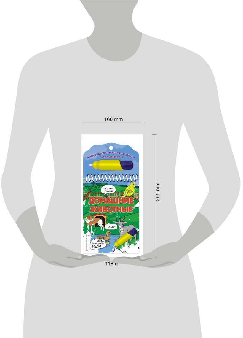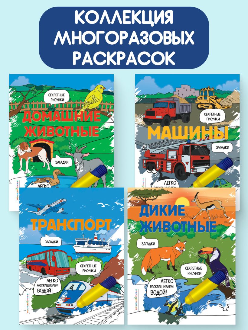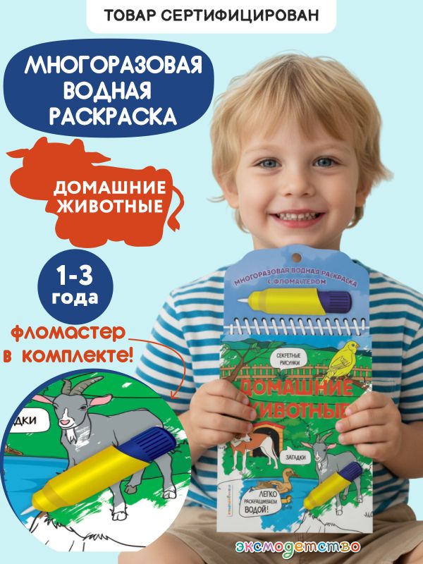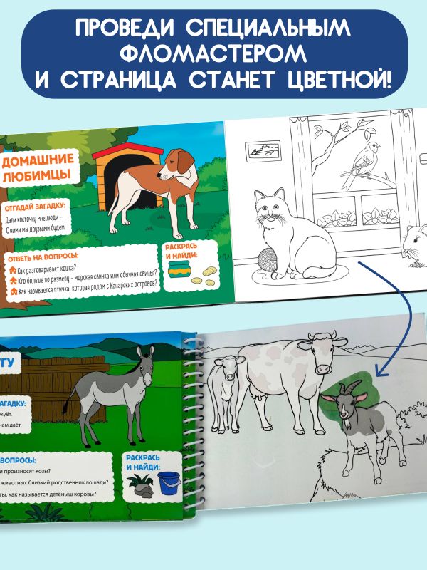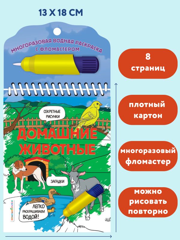 Представляем новое поколение раскрасок! Во-первых, вам больше не нужны цветные карандаши или фломастеры. Просто наполните специальный фломастер, входящий в комплект, водой и проведите им по страницам — они сразу же станут цветными. Поэтому раскраской смогут пользоваться даже самые маленькие дети, только начинающие держать ручку. Во-вторых, эта раскраска многоразовая. После высыхания страницы из прочного картона снова станут чёрно-белыми, и их можно раскрашивать повторно. В-третьих, эта раскраска развивающая: на каждом развороте есть задания на внимание и мышление, стихотворные загадки и даже скрытые предметы, появляющиеся из ниоткуда! Раскрашивая реалистичные иллюстрации, ваш малыш с интересом познакомится с разными видами домашних животных.